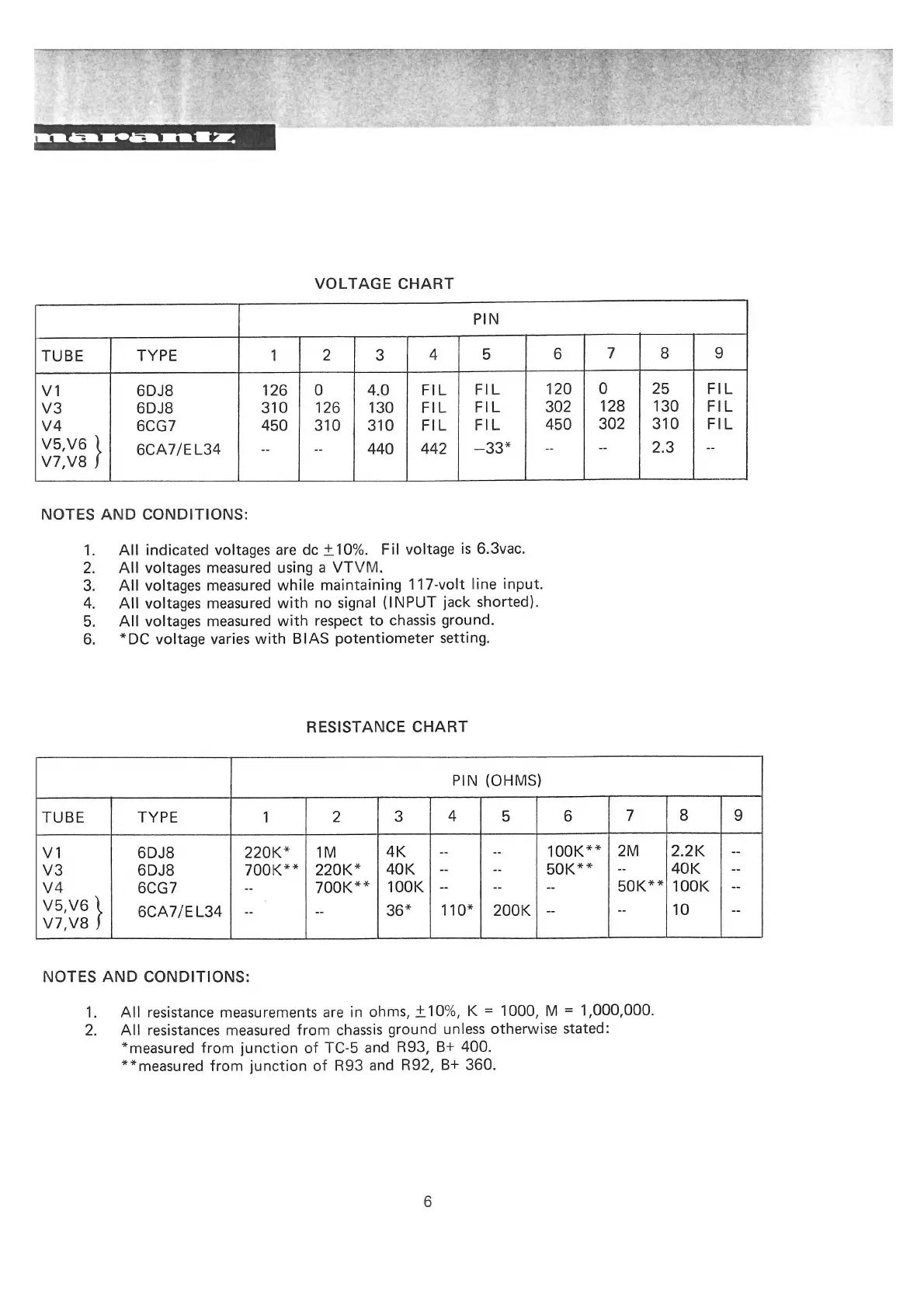 Marantz 9 - Voltage and Resistance Charts; Voltage Chart; Resistance Chart