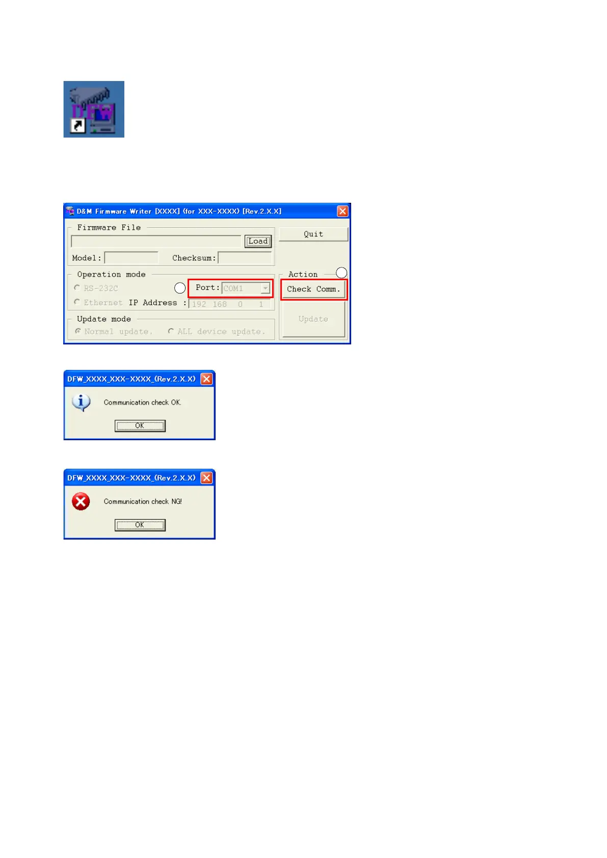 (4) If connection is not good, then you can see the "Communication check NG" message.