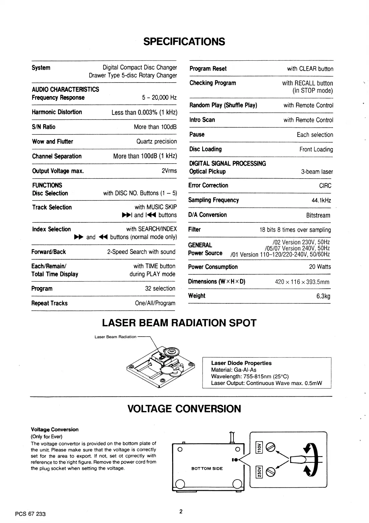Marantz CC-52 - Specifications; Laser Beam Radiation Spot; Voltage Conversion