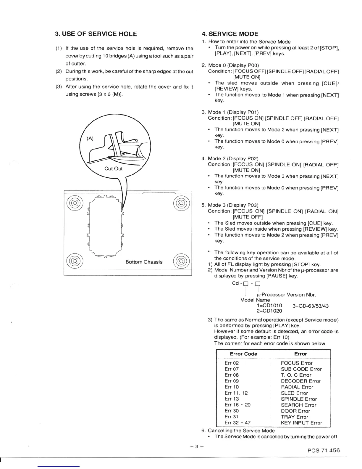 Marantz CD-43 - Service Hole Usage; Service Hole Access Procedure; Service Mode Operations; Entering and Navigating Service Mode