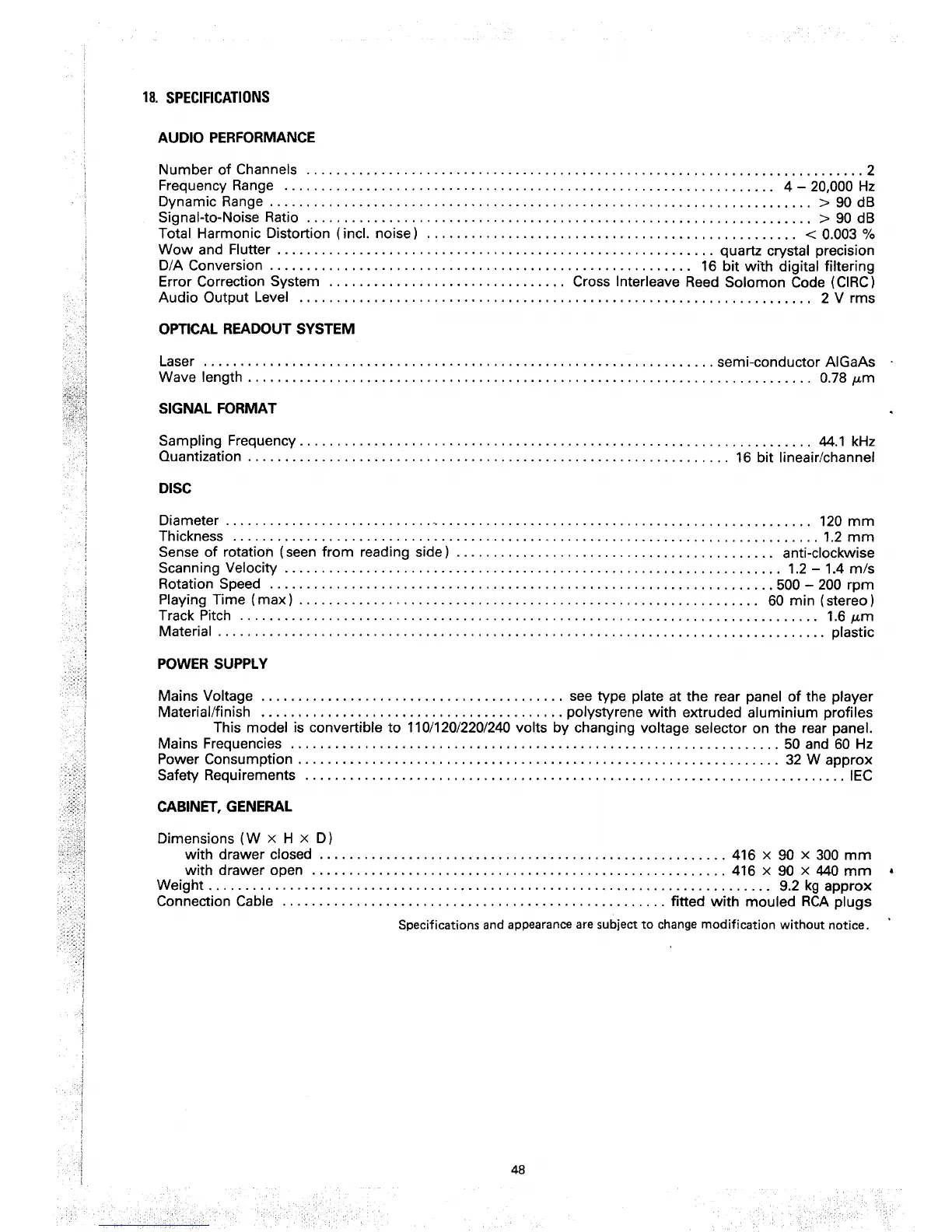 Marantz CD-74 - Product Specifications; Audio Performance Specifications; Optical Readout System Specs; Signal Format Details