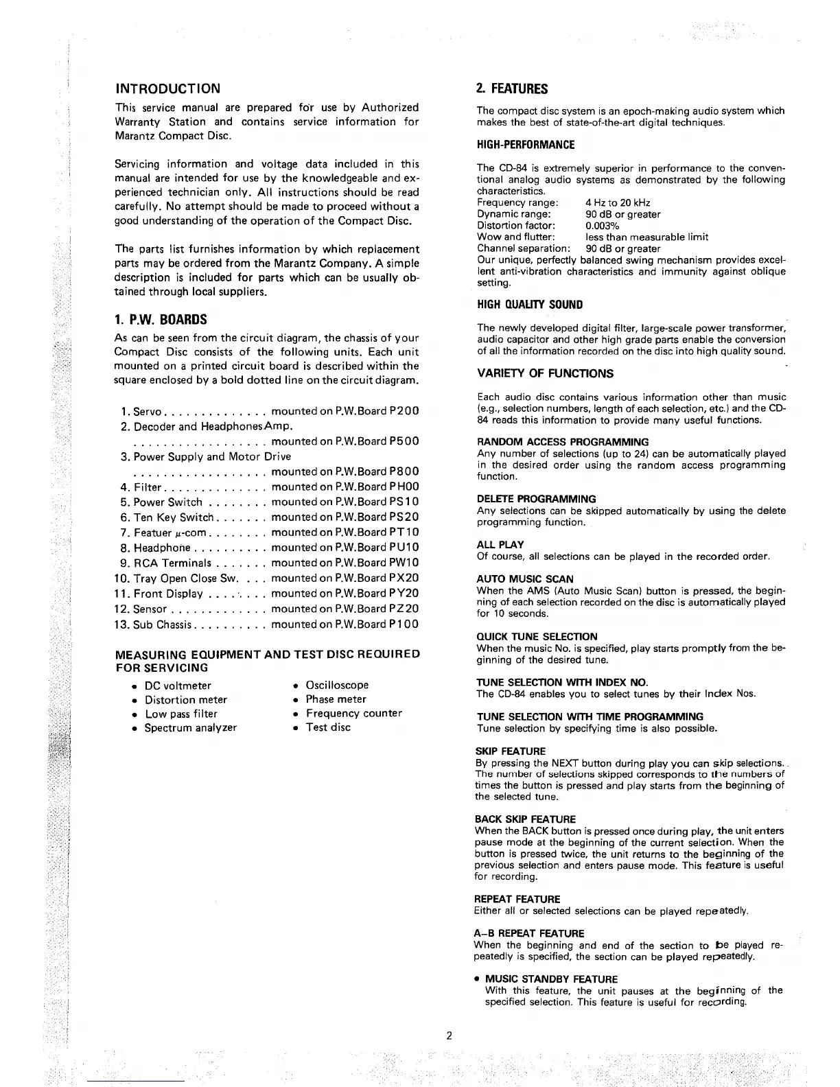 Marantz CD-84 - P.W. Boards; Features; High Quality Sound; Variety of Functions