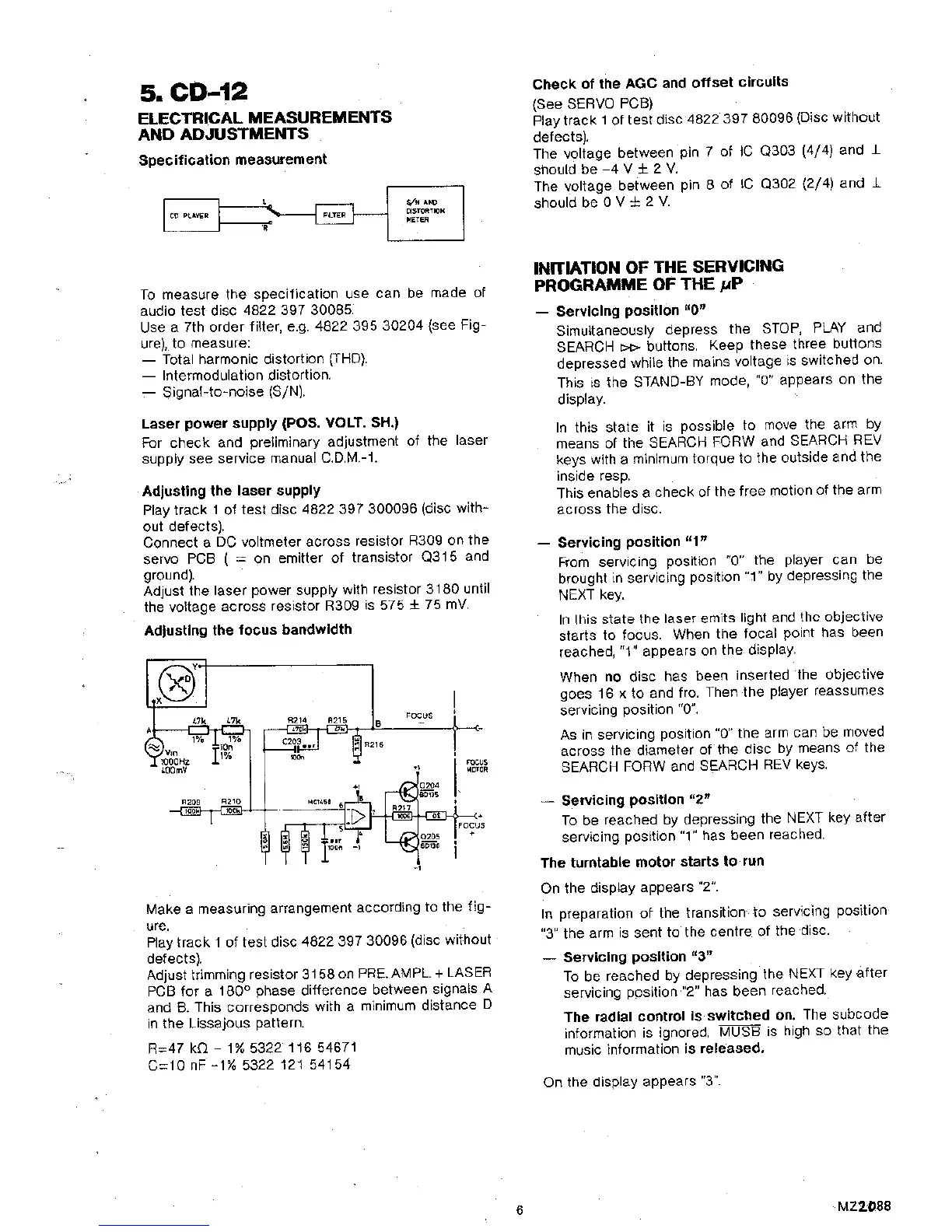 Marantz CD-95DR - CD-12 ELECTRICAL MEASUREMENTS AND ADJUSTMENTS; Specification measurement; Laser power supply (POS. VOLT. SH.); Adjusting the focus bandwidth