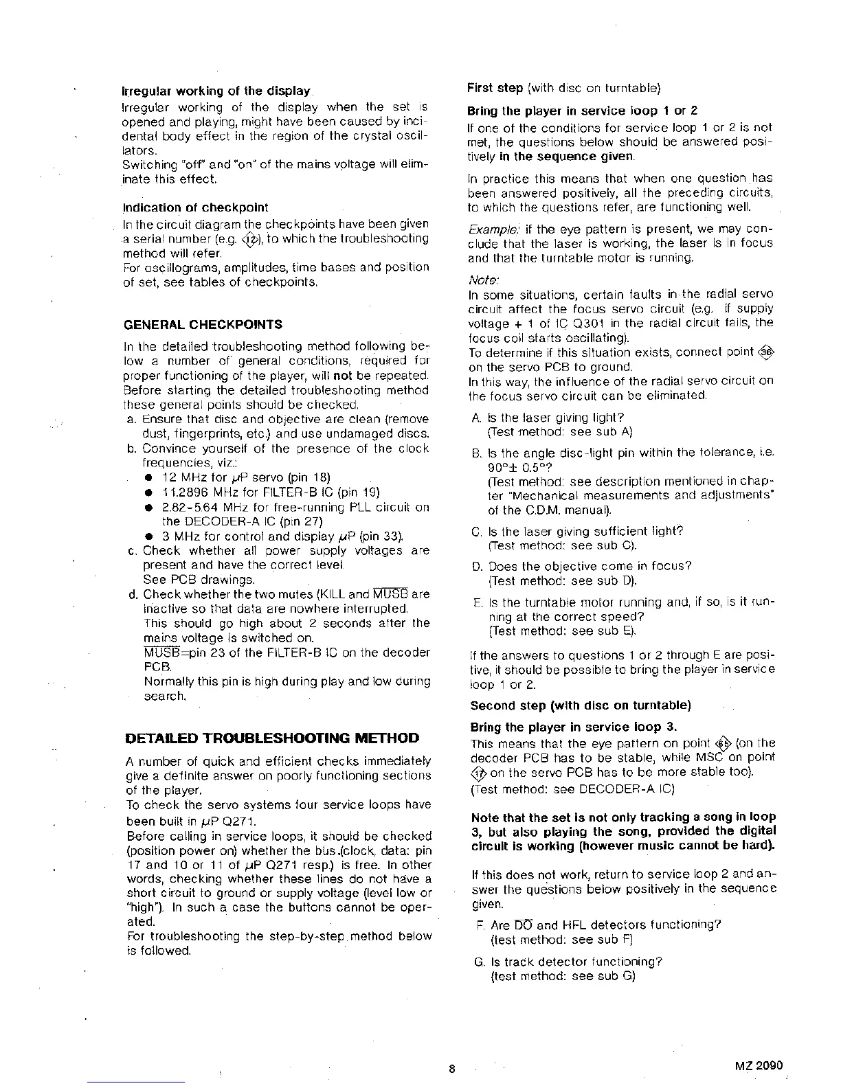 Marantz CD-95DR - GENERAL CHECKPOINTS; DETAILED TROUBLESHOOTING METHOD; First step (with disc on turntable); Second step (with disc on turntable)
