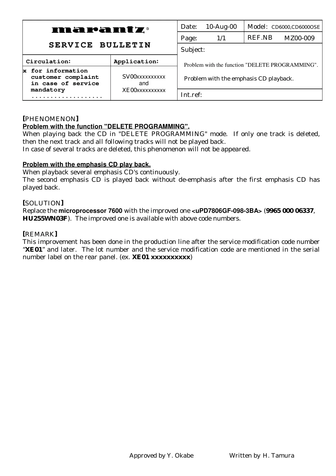 Approved by Y. Okabe Written by H. Tamura