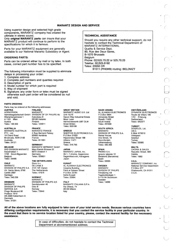 Marantz CDA-94 - Ordering Parts; Technical Assistance