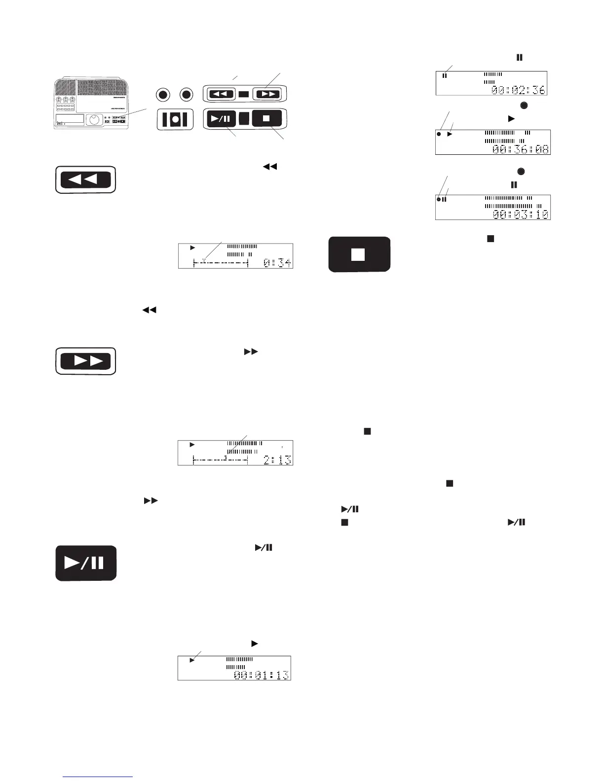 Button lit during play or record, fl ashing during pause.