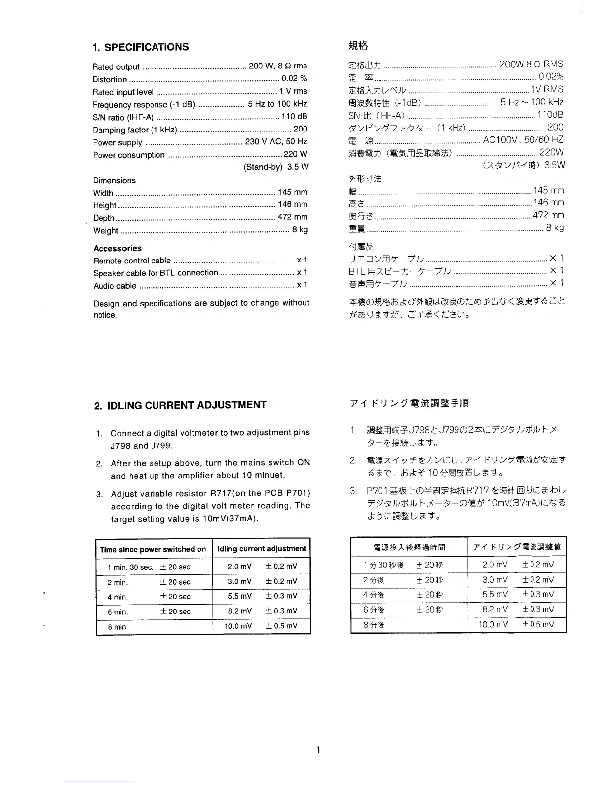 Marantz MA700 U - Specifications; Idling Current Adjustment