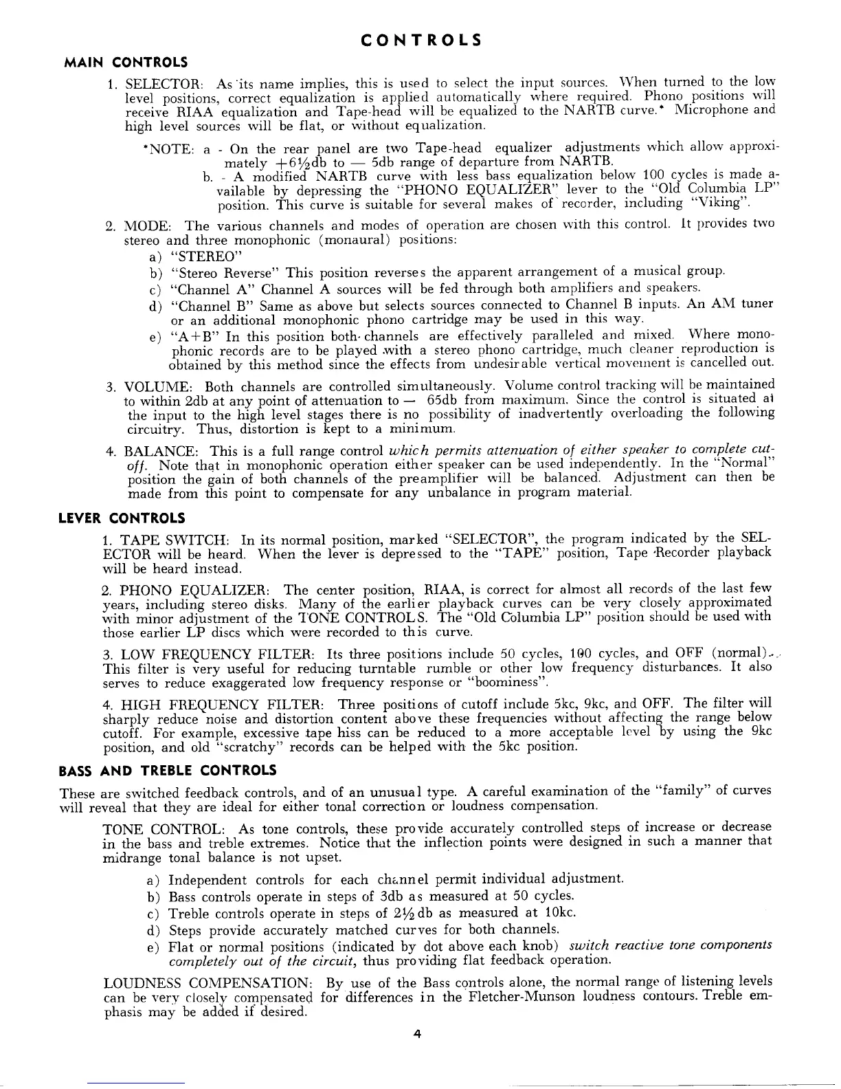Marantz Model 7 - Control Descriptions; Main Controls Explained; Lever Control Functions; Bass and Treble Controls