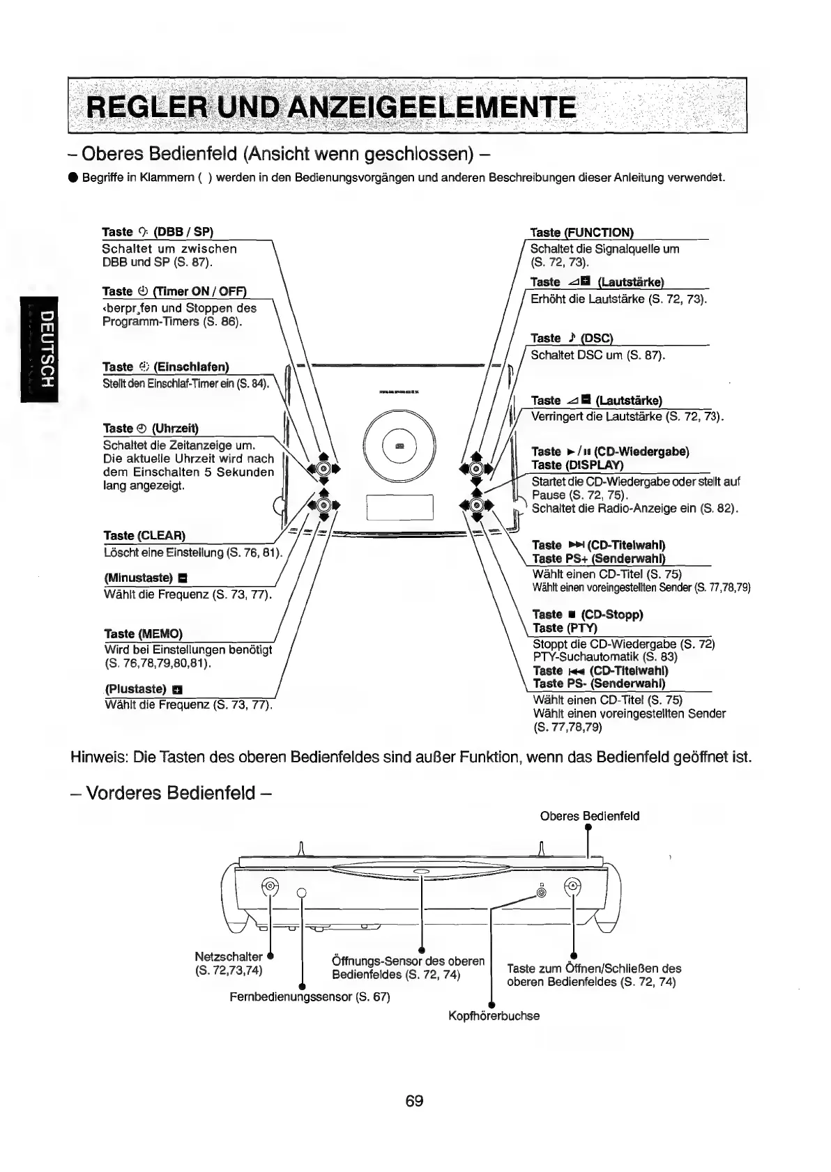 Marantz MR2020 - Oberes Bedienfeld (Ansicht wenn Geschlossen); Regler und Anzeigeelemente; Vorderes Bedienteld Sii Cscssiscisscecsssastelesavceacevetcestassencbncadees Dcativcaccudedeedcecededecsucavéeesuuedaccdsscnteauavtsavedewacencessesusecescesbastere