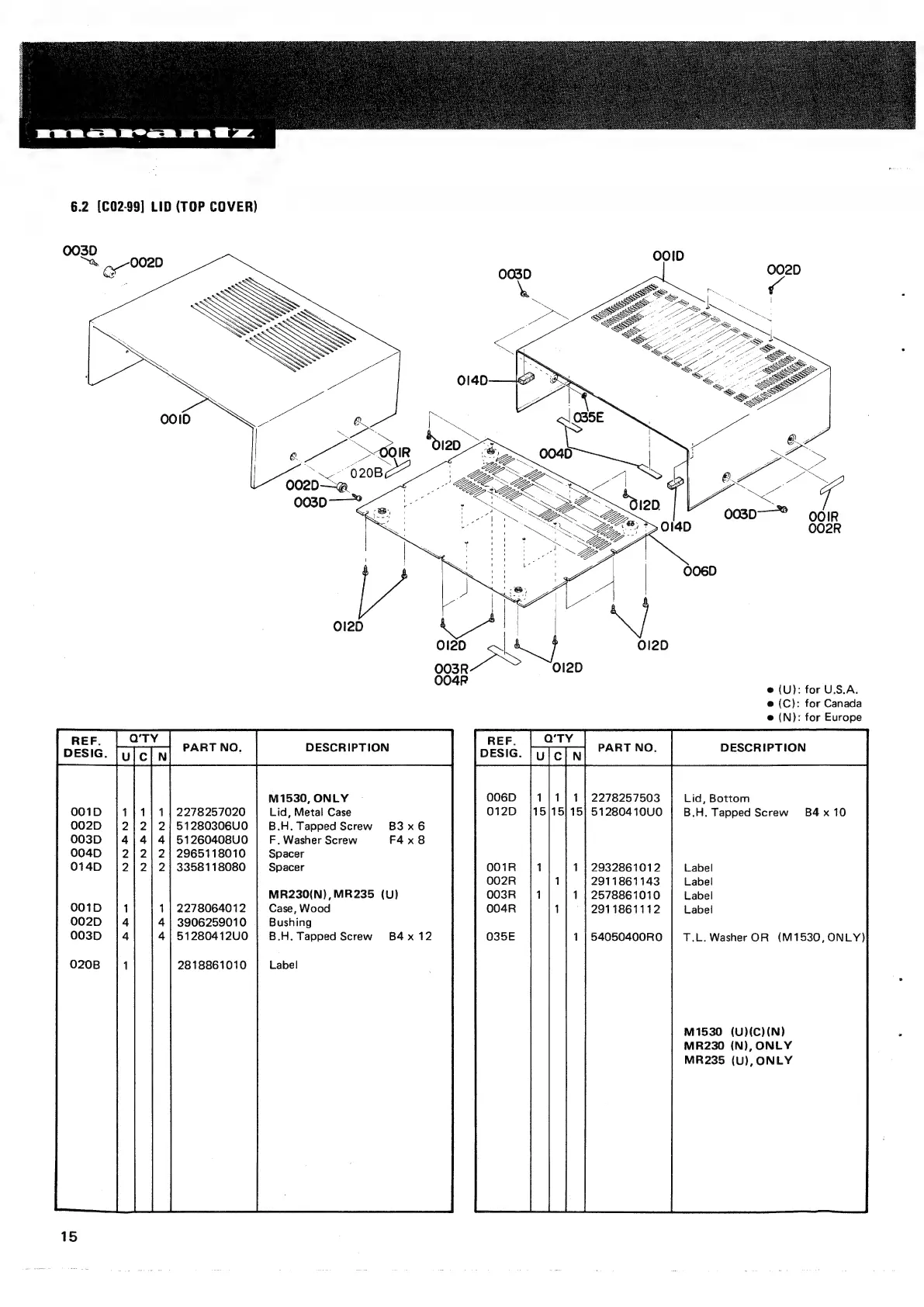 Marantz MR230 - Lid (Top Cover) Parts List