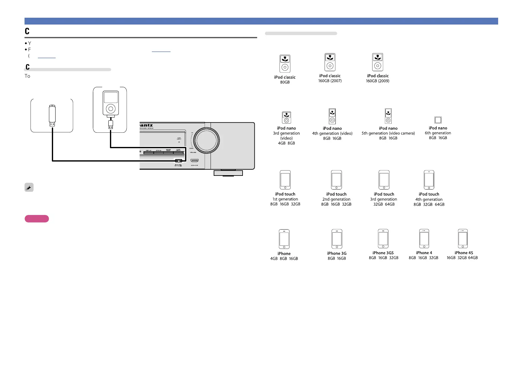 •For operating instructions see “Playing an iPod” (vpage 33) or “Playing a USB memory device”
