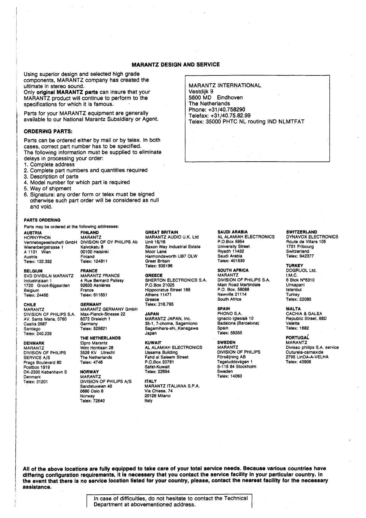 Marantz PM-50 - Marantz Design and Service; Ordering Parts