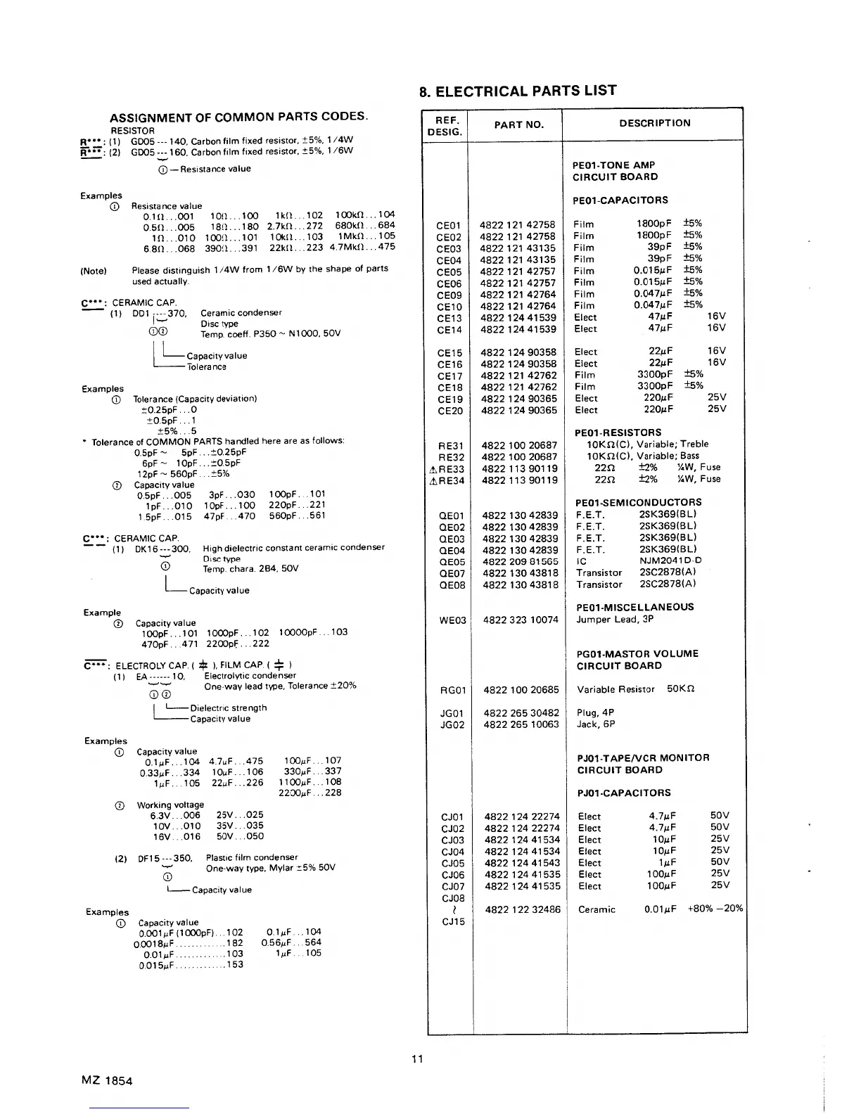 Marantz PM-65AV - Electrical Parts List (Part 1); PE01, PG01, PJ01 Circuit Board Components