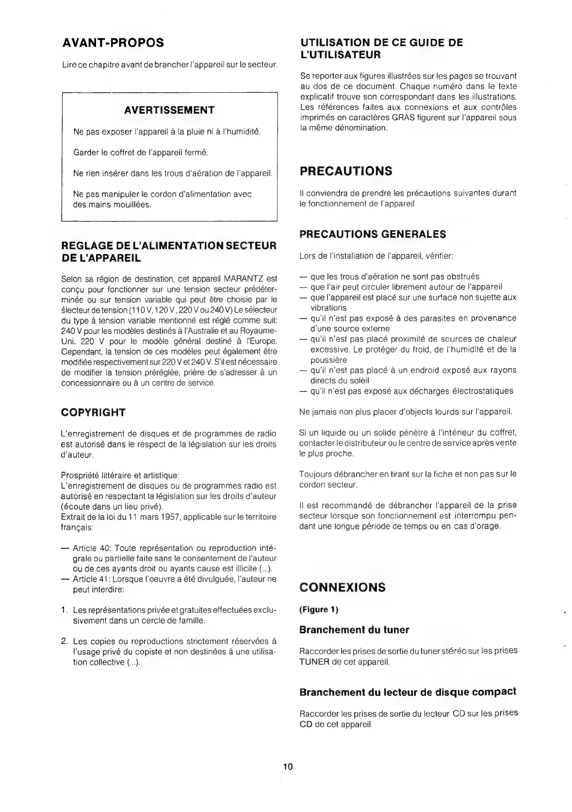 Marantz PM-80 - Branchement du Tuner; Branchement du Lecteur de Disque Compact; Réglage de Lalimentation Secteur de Lappareil; Connexions