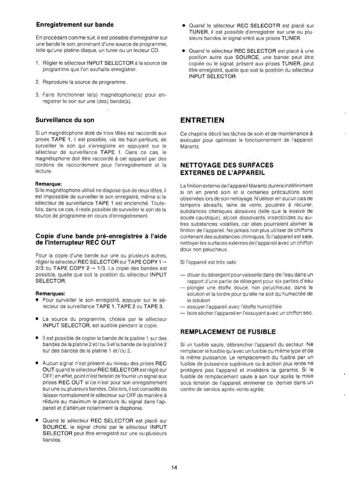 Marantz PM-80 - Enregistrement Sur Bande; Copie Dune Bande Pré-Enregistrée a Laide de Linterrupteur REC out; Entretien; Nettoyage des Surfaces Externes de Lappareil ©0000