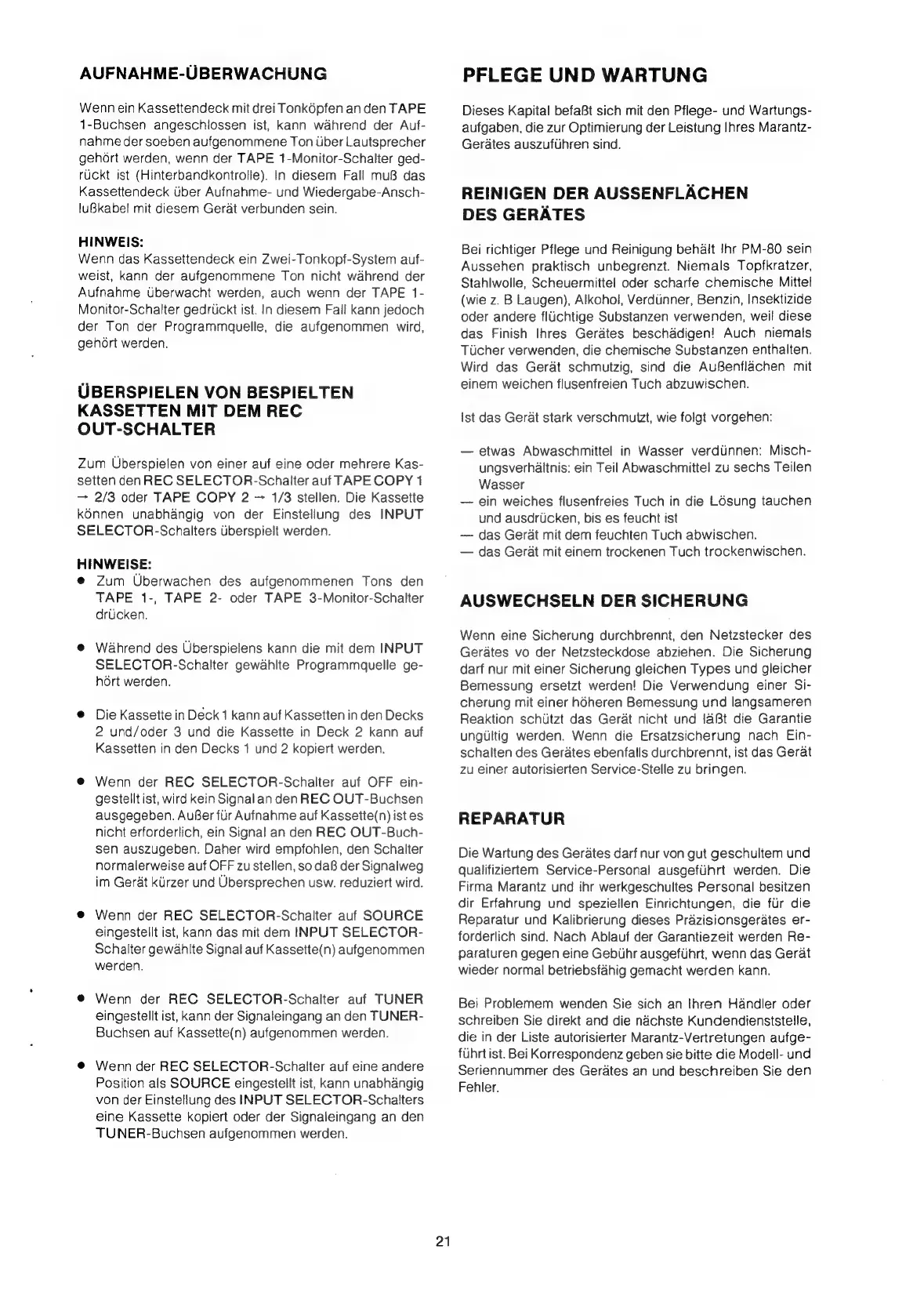 Marantz PM-80 - Aufnahme-Tiberwachung; Auswechseln der Sicherung; Pflege und Wartung; Reinigen der Aussenflachen des Gerates
