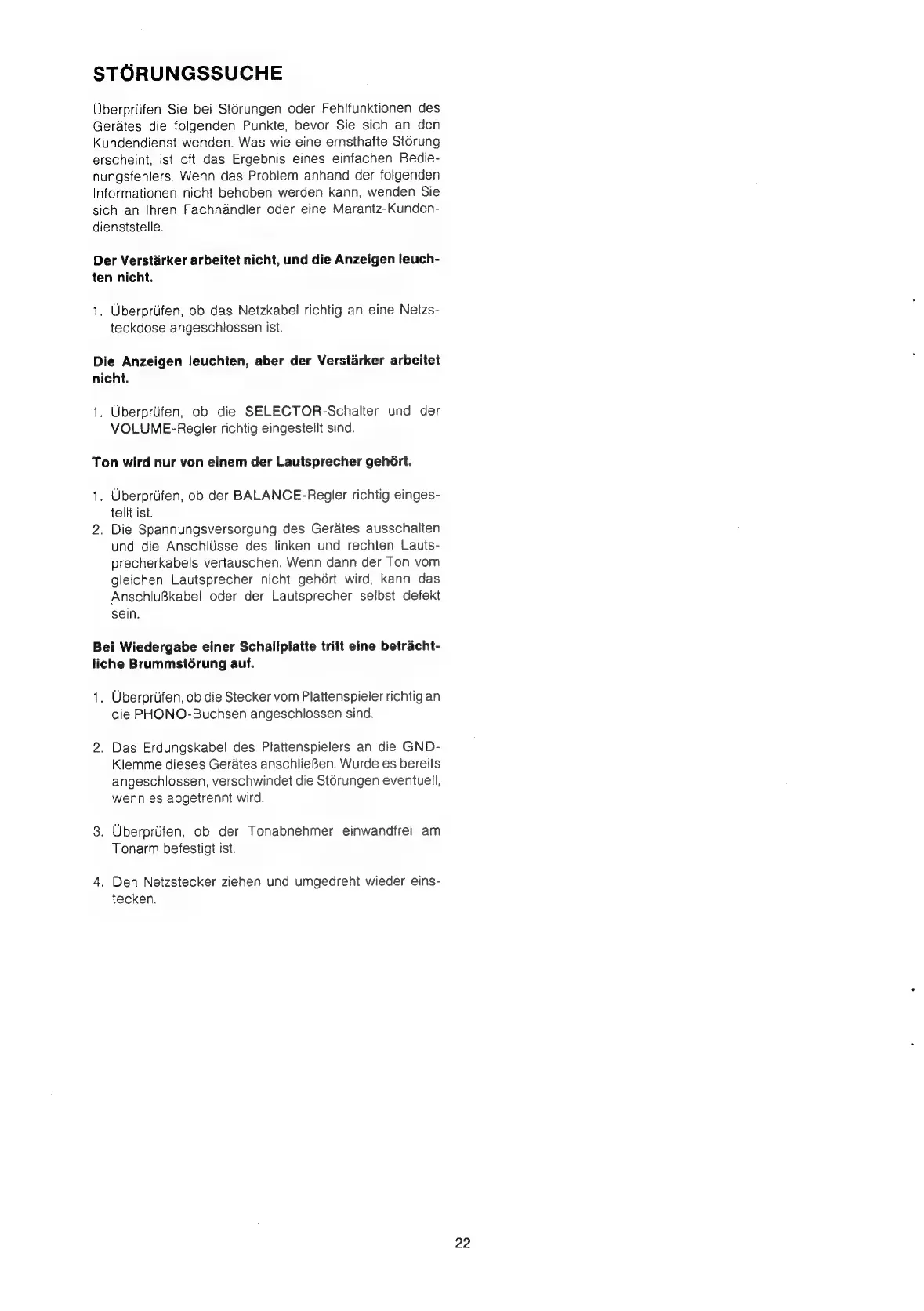 Marantz PM-80 - Bei Wiedergabe einer Schallplatte Tritt eine Betrachtliche Brummstgrung auf; Der Verstarker Arbeitet Nicht, und die Anzeigen Leuchten nicht; Die Anzeigen Leuchten, aber der Verstarker Arbeitet nicht; Storungssuche