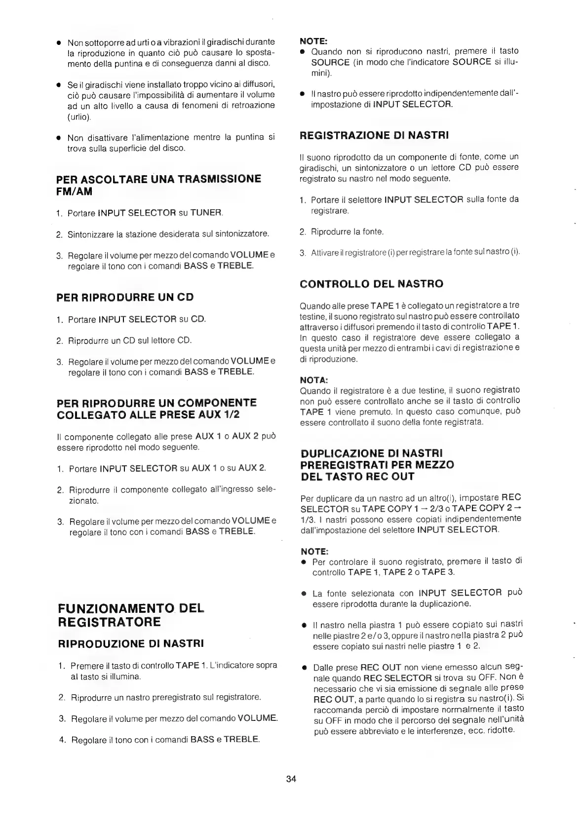 Marantz PM-80 - Controtlo.del Nastro; Duplicazione DI Nastri Preregistrati Per Mezzo del Tasto Rec out; Funzionamento del Registratore; Per Ascoltare una Trasmissione FM;AM