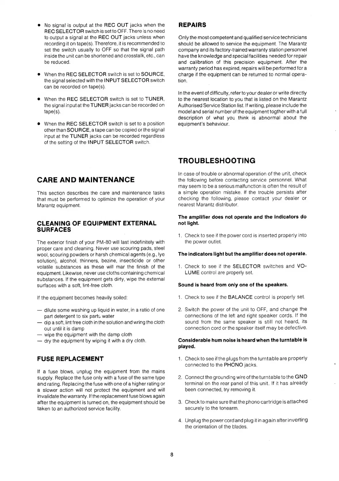 Marantz PM-80 - Troubleshooting; No Power or Indicators; No Sound Operation; Speaker and Hum Issues
