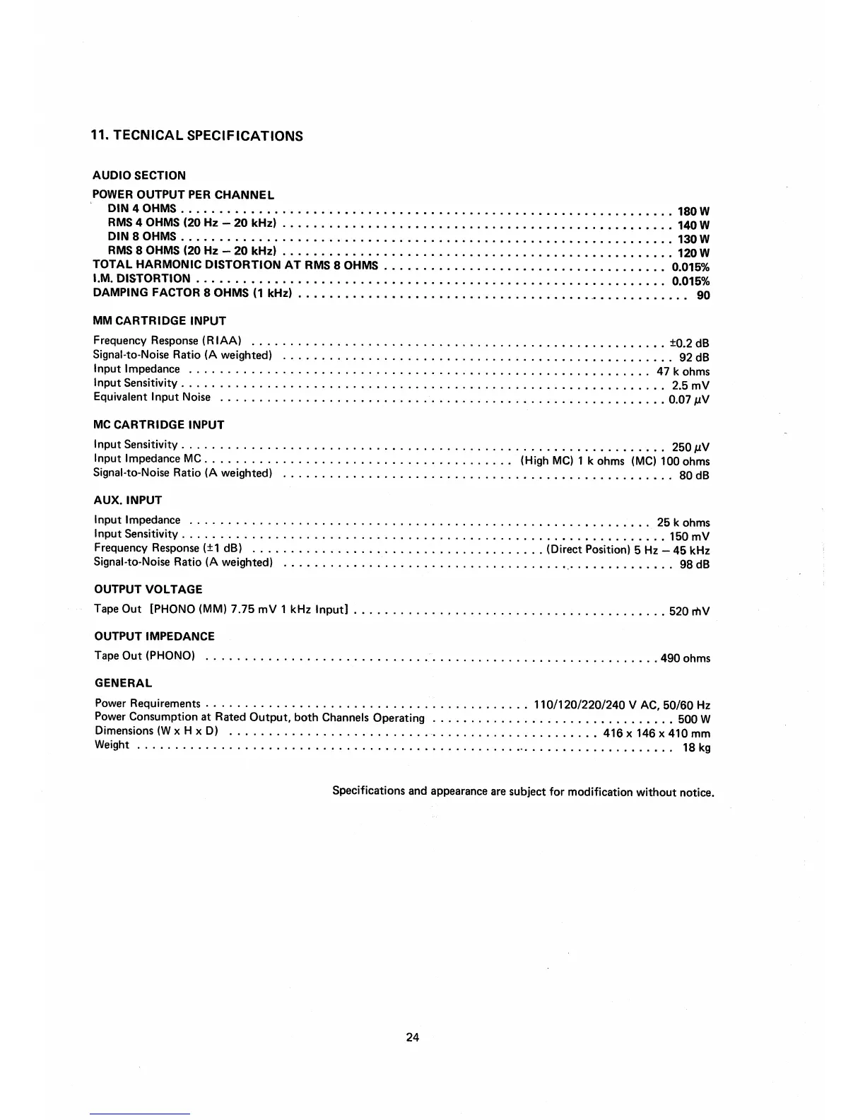 Marantz PM-84 - Marantz PM-84 Technical Specifications; Audio Performance and Input;Output Specifications