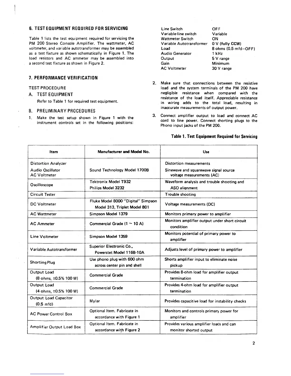 Marantz PM200 - TEST EQUIPMENT REQUIRED FOR SERVICING; PERFORMANCE VERIFICATION; TEST EQUIPMENT; PRELIMINARY PROCEDURES