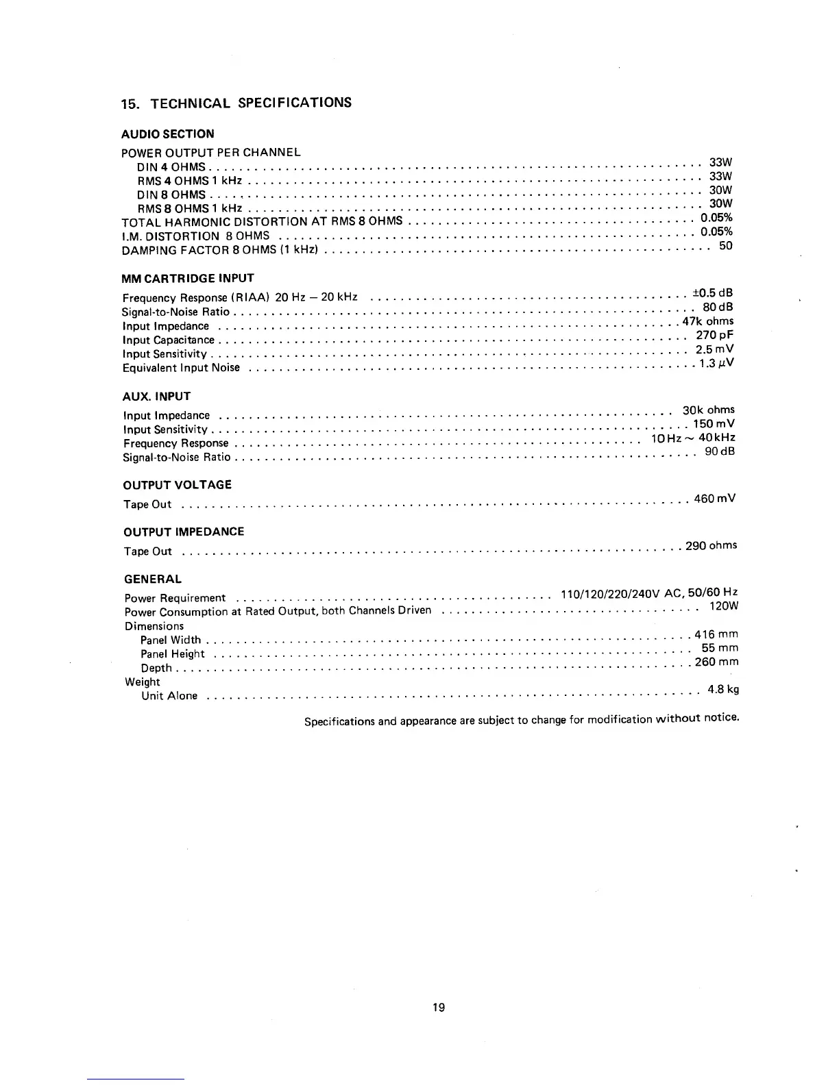 Marantz PM230 - Technical Specifications; Audio Performance Specs; MM Cartridge Input Specs; Auxiliary Input Specs