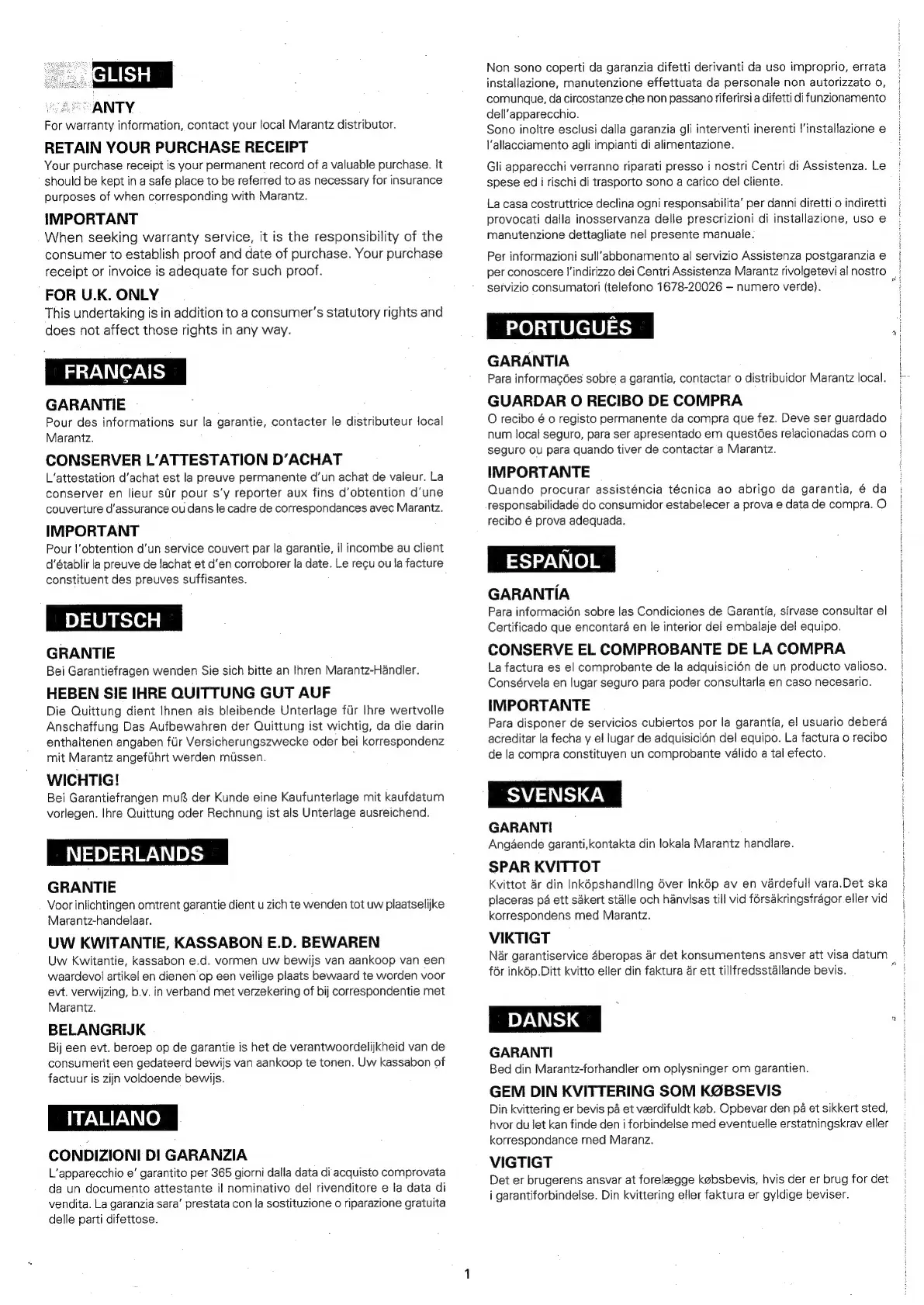 Marantz PM488AV - WARRANTY INFORMATION