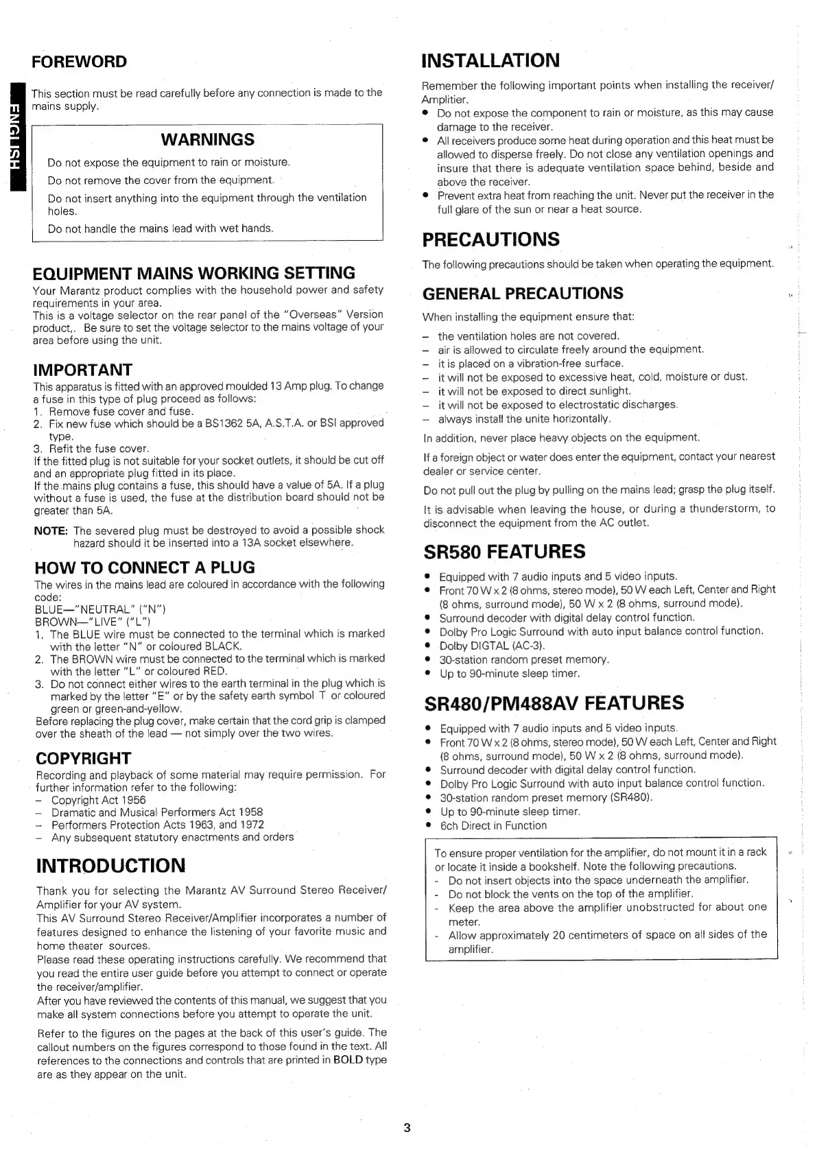 Marantz PM488AV - SAFETY AND INSTALLATION; General Precautions and Warnings; EQUIPMENT SETUP AND FEATURES