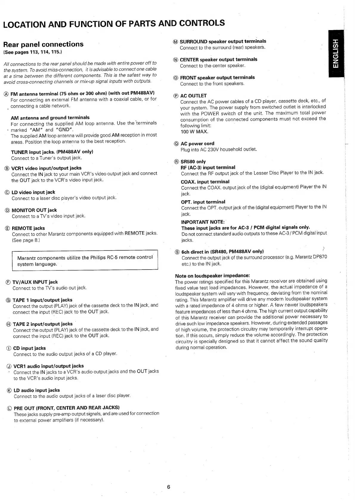 Marantz PM488AV - PARTS AND CONTROLS LOCATION; Rear Panel Connections Overview