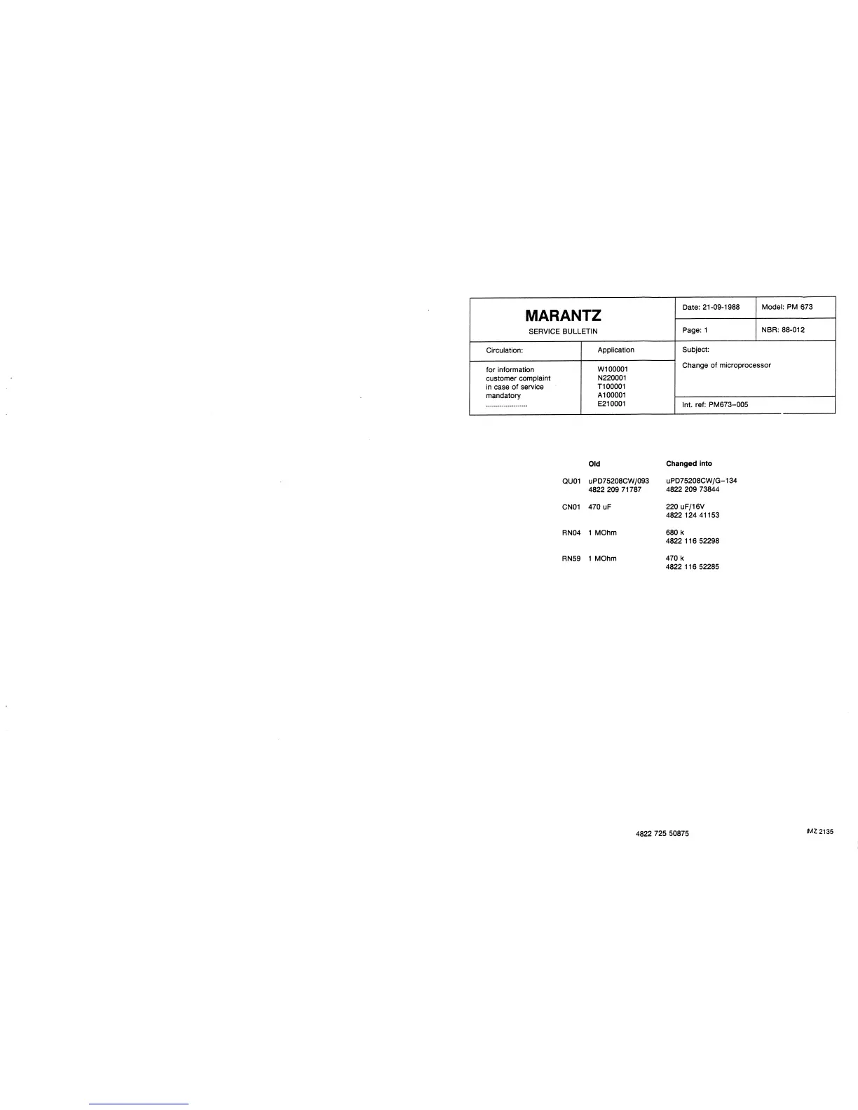 Marantz PM673 - Service Bulletin; NBR: 88-012