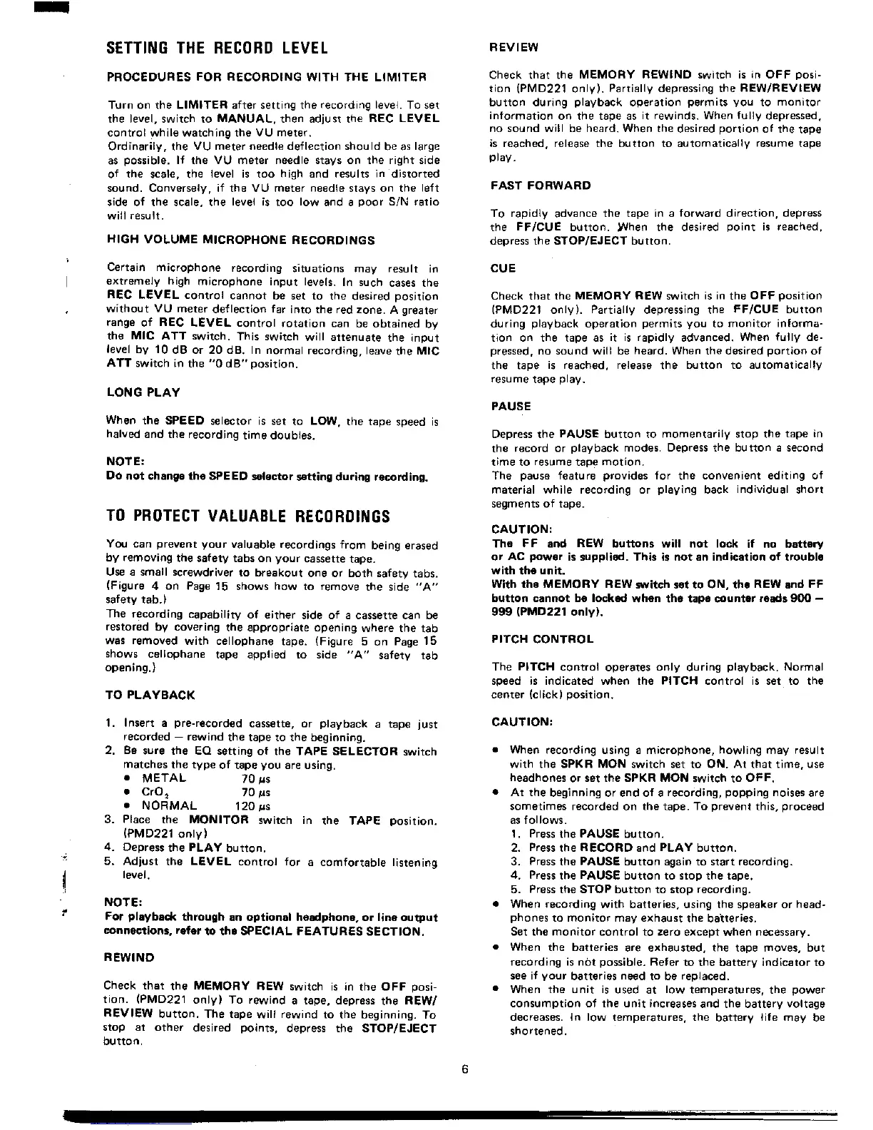 Marantz PMD 201 - Setting the Record Level; Procedures for Recording with the Limiter; High Volume Microphone Recordings; Long Play