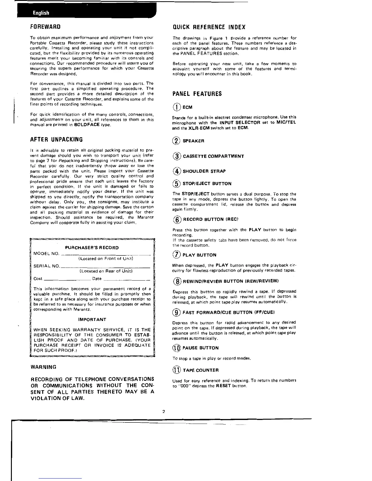 Marantz PMD222 - Controls and Panel Features; Front Panel Controls (1-11)