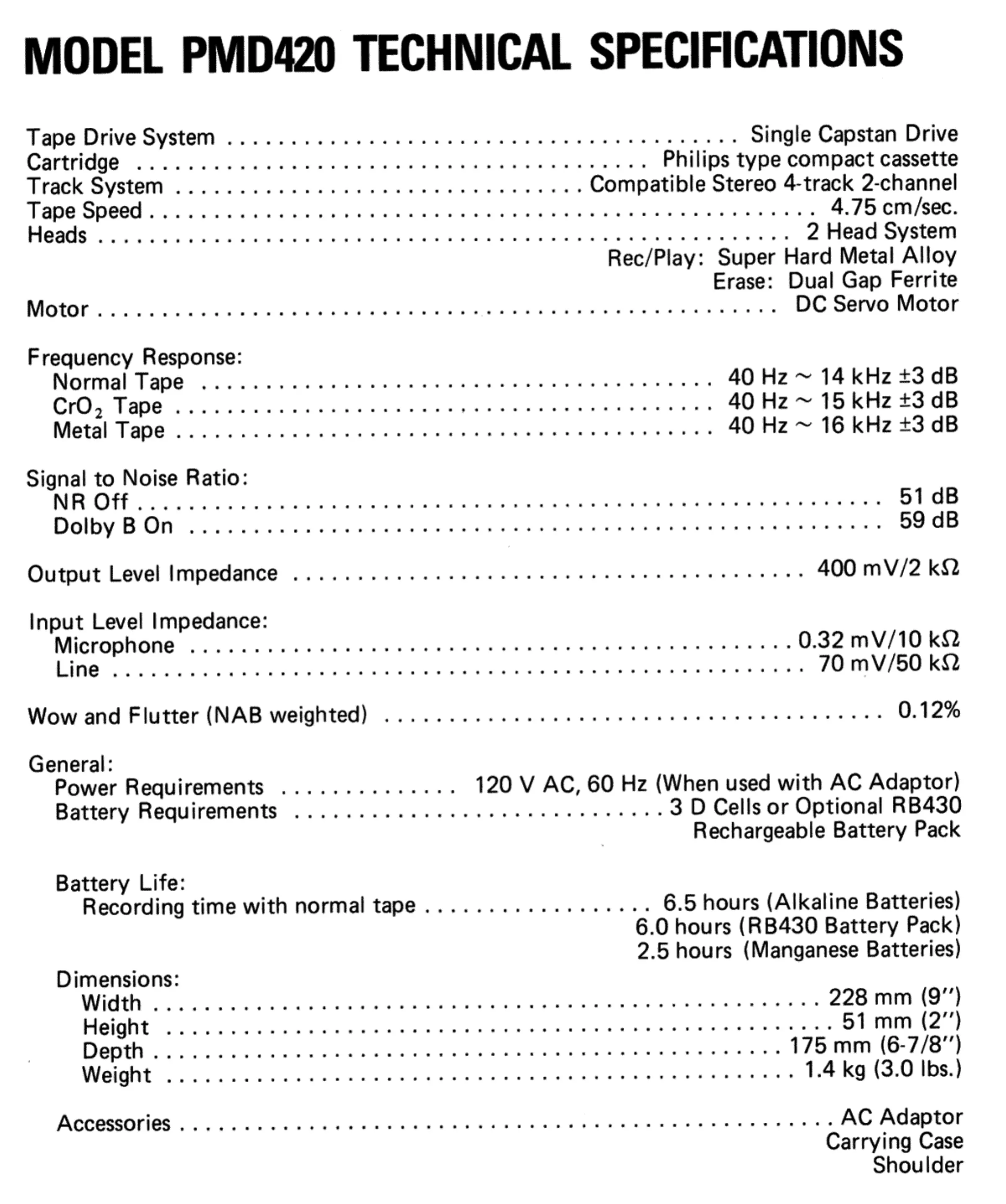 Marantz pmd430 - MODEL PMD420 TECHNICAL SPECIFICATIONS; PERFORMANCE SPECIFICATIONS; PHYSICAL AND POWER SPECIFICATIONS