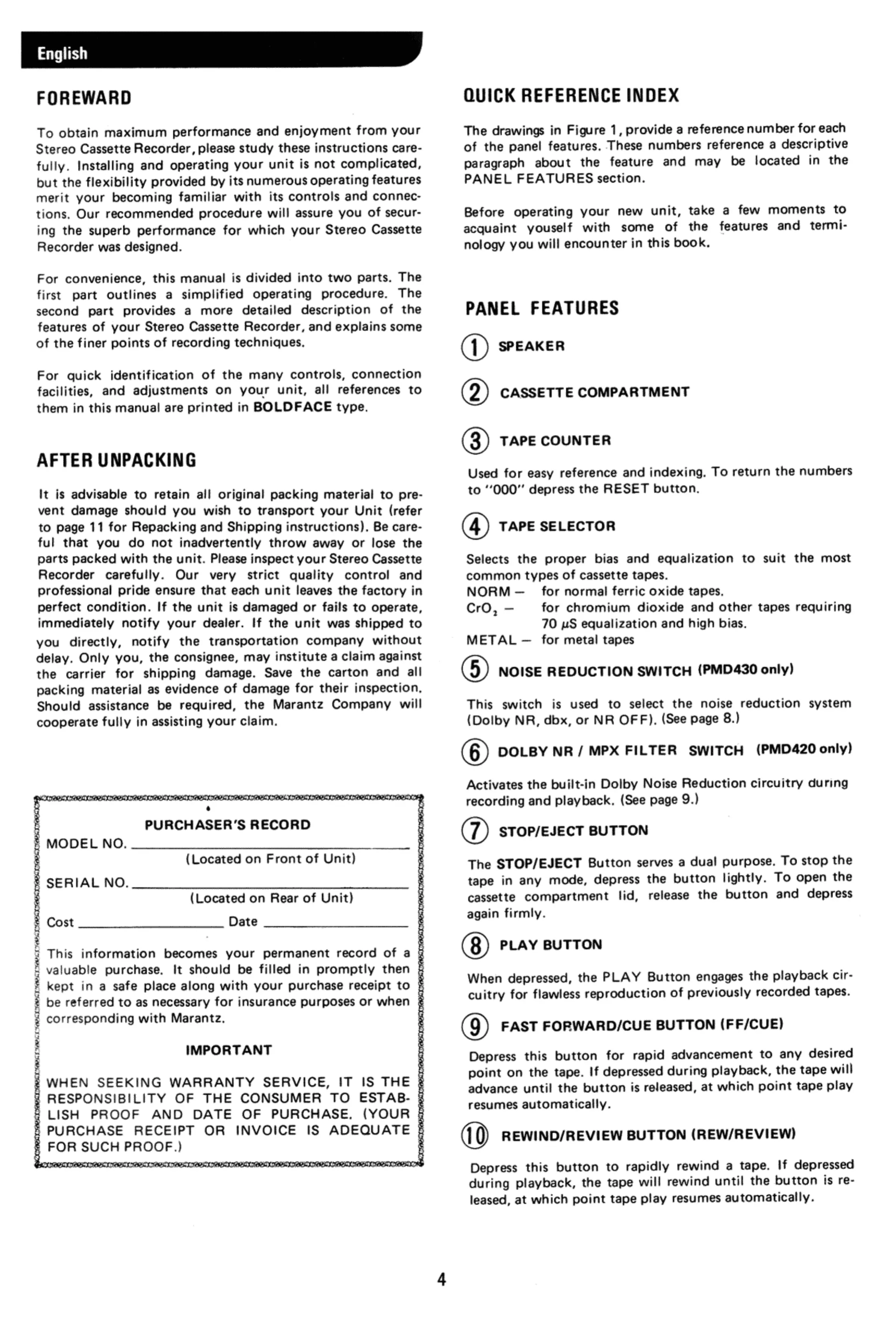 Marantz pmd430 - FOREWORD; QUICK REFERENCE INDEX; PANEL FEATURES
