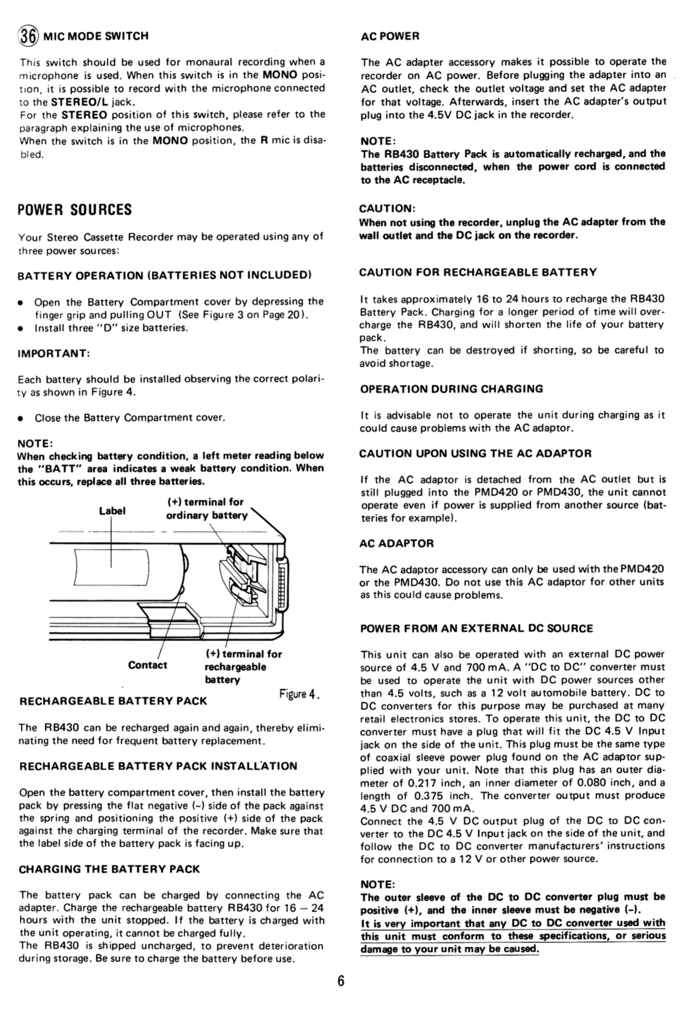 Marantz pmd430 - POWER SOURCES AND ADAPTERS; BATTERY OPERATION; AC POWER ADAPTER; EXTERNAL DC POWER SOURCE