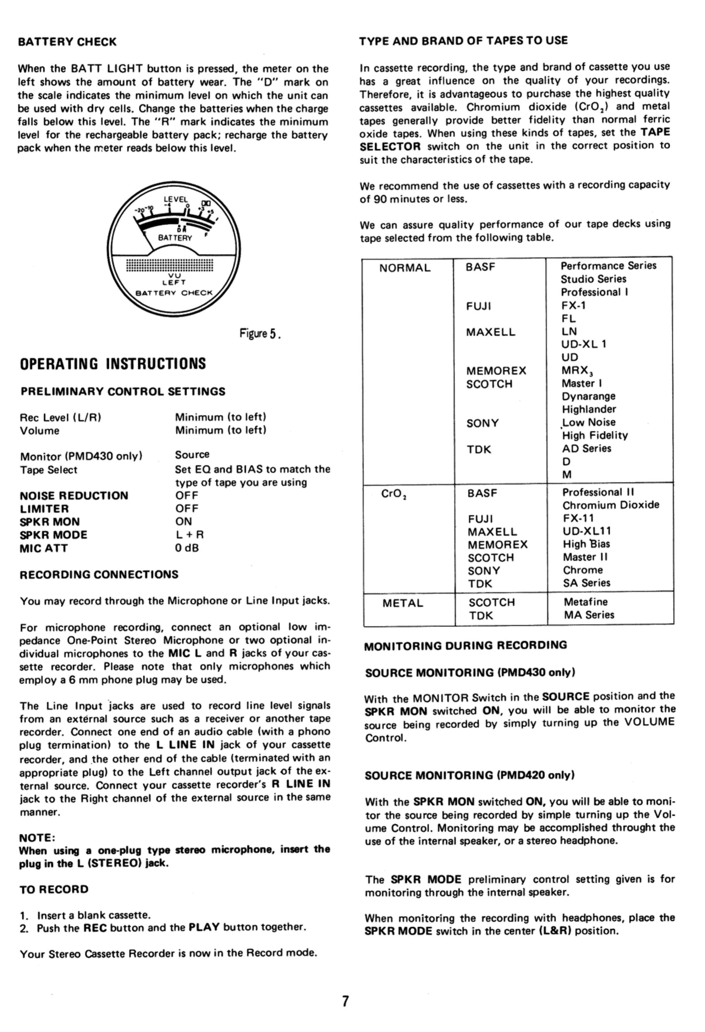 Marantz pmd430 - OPERATING INSTRUCTIONS; PRELIMINARY CONTROL SETTINGS; RECORDING CONNECTIONS; MONITORING DURING RECORDING