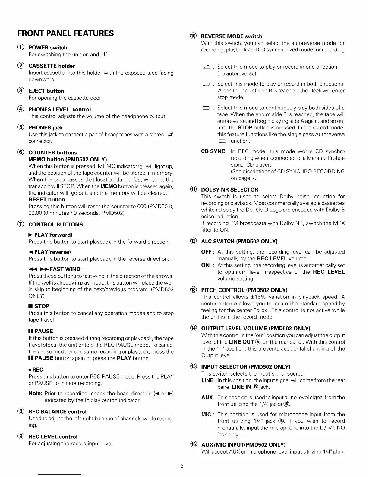 Marantz PMD501 - Front Panel Features; Power Switch; Control Buttons; Reverse Mode Switch
