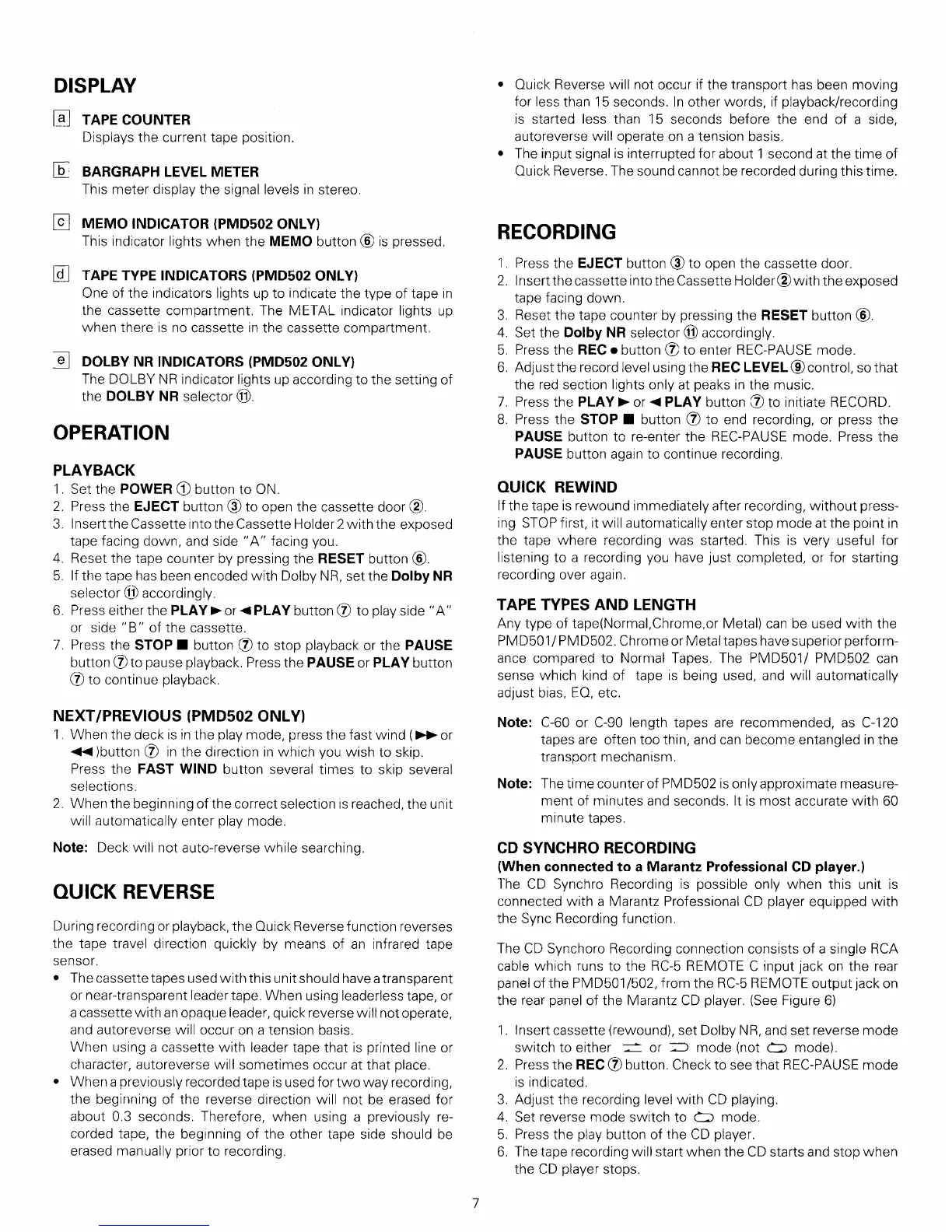 Marantz PMD502 - Display; Tape Counter; Bargraph Level Meter; Memo Indicator (PMD502 ONLY)