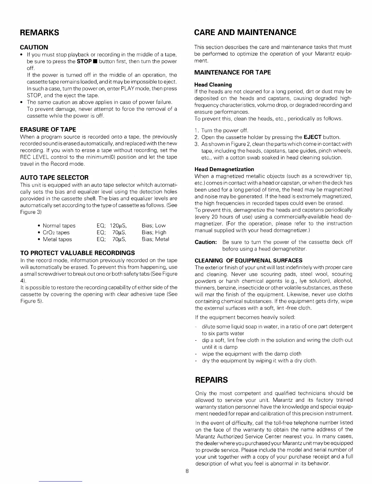 Marantz PMD502 - Remarks; Care and Maintenance; Maintenance for Tape; Head Demagnetization
