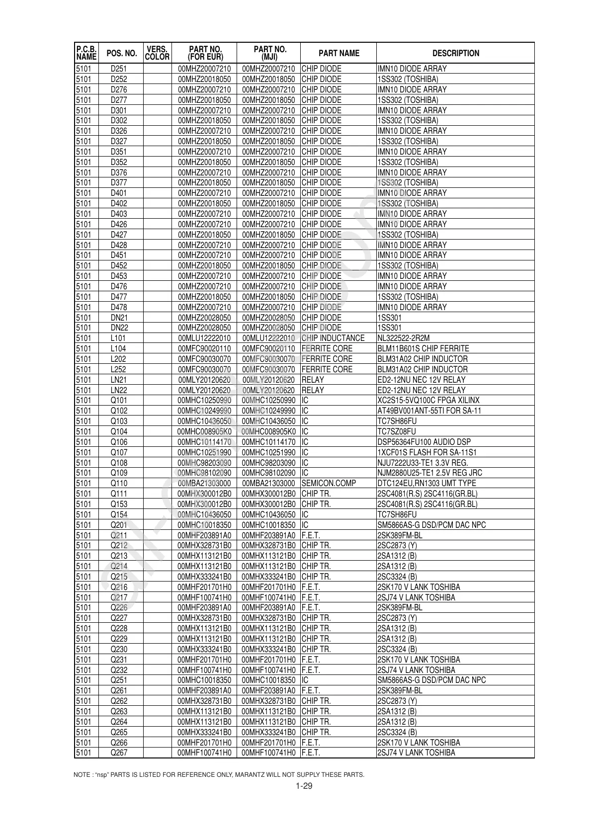 NOTE : “nsp” PARTS IS LISTED FOR REFERENCE ONLY, MARANTZ WILL NOT SUPPLY THESE PARTS.