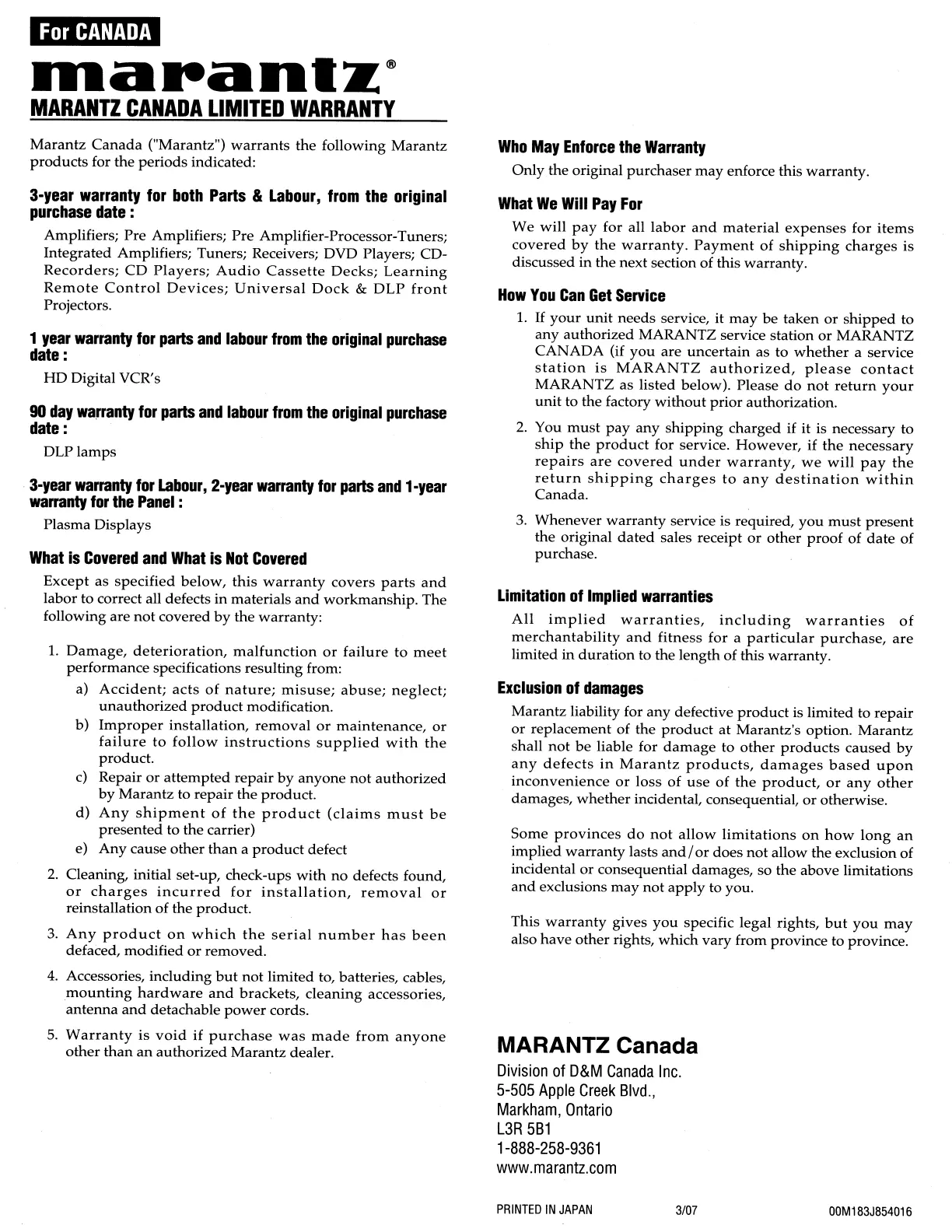 Marantz SA8003 - CANADA LIMITED WARRANTY; WHAT IS COVERED AND NOT COVERED (Canada); HOW TO GET SERVICE (Canada)
