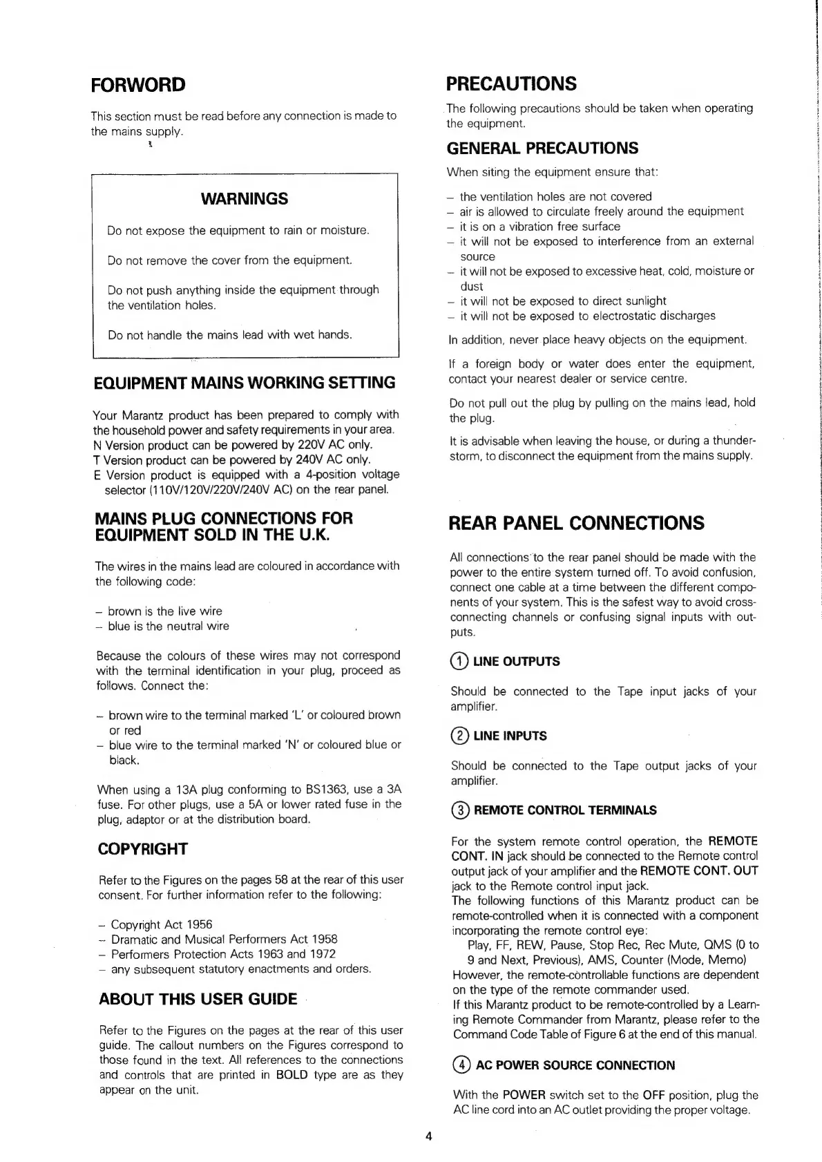 Marantz SD-60 - Forword and Safety; General Safety Warnings; Equipment Mains Working Setting; UK Mains Plug Connections