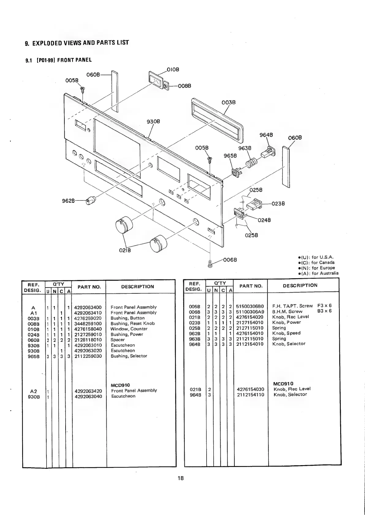 Marantz SD1000 - Exploded Views and Parts List; Front Panel Components List