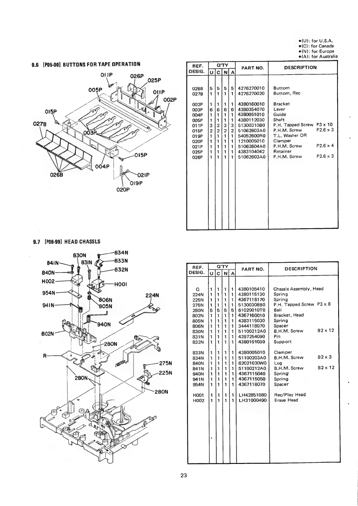 Marantz SD1000 - Exploded Views and Parts List; Tape Operation Buttons Parts List; Head Chassis Components List