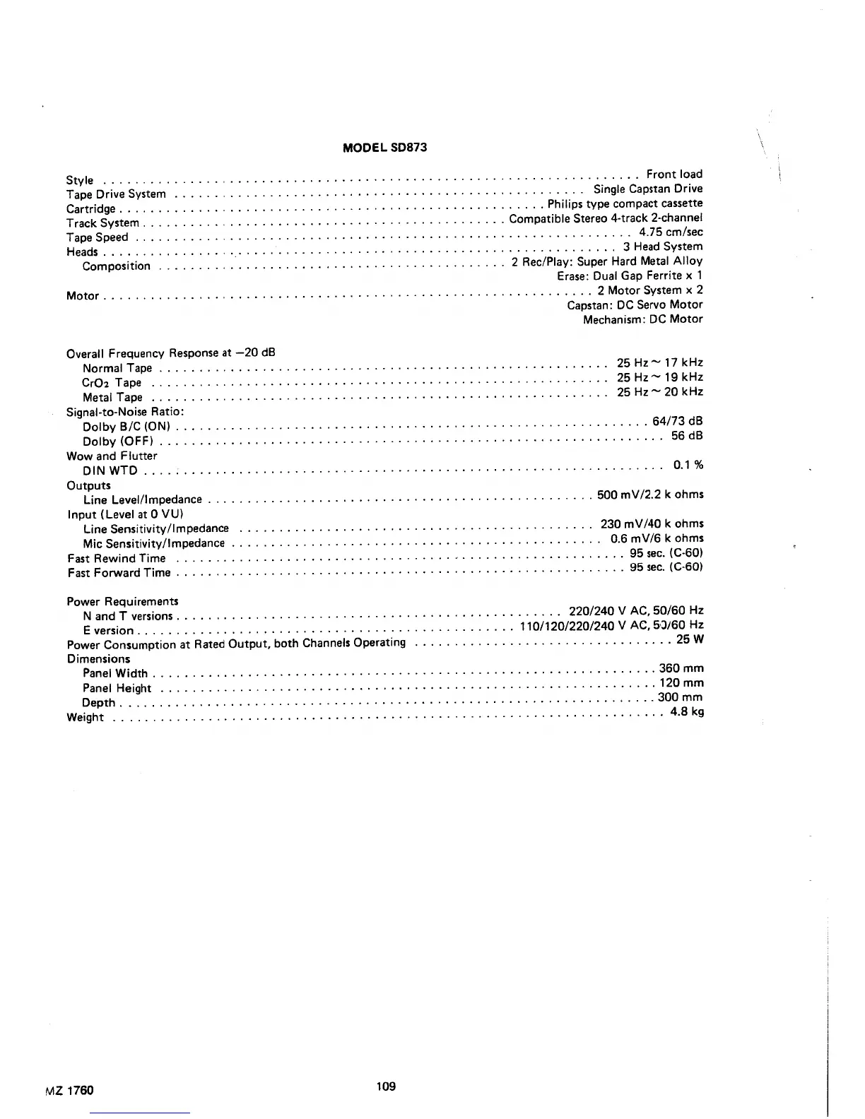 Marantz SD873 - Cassette Deck Specifications