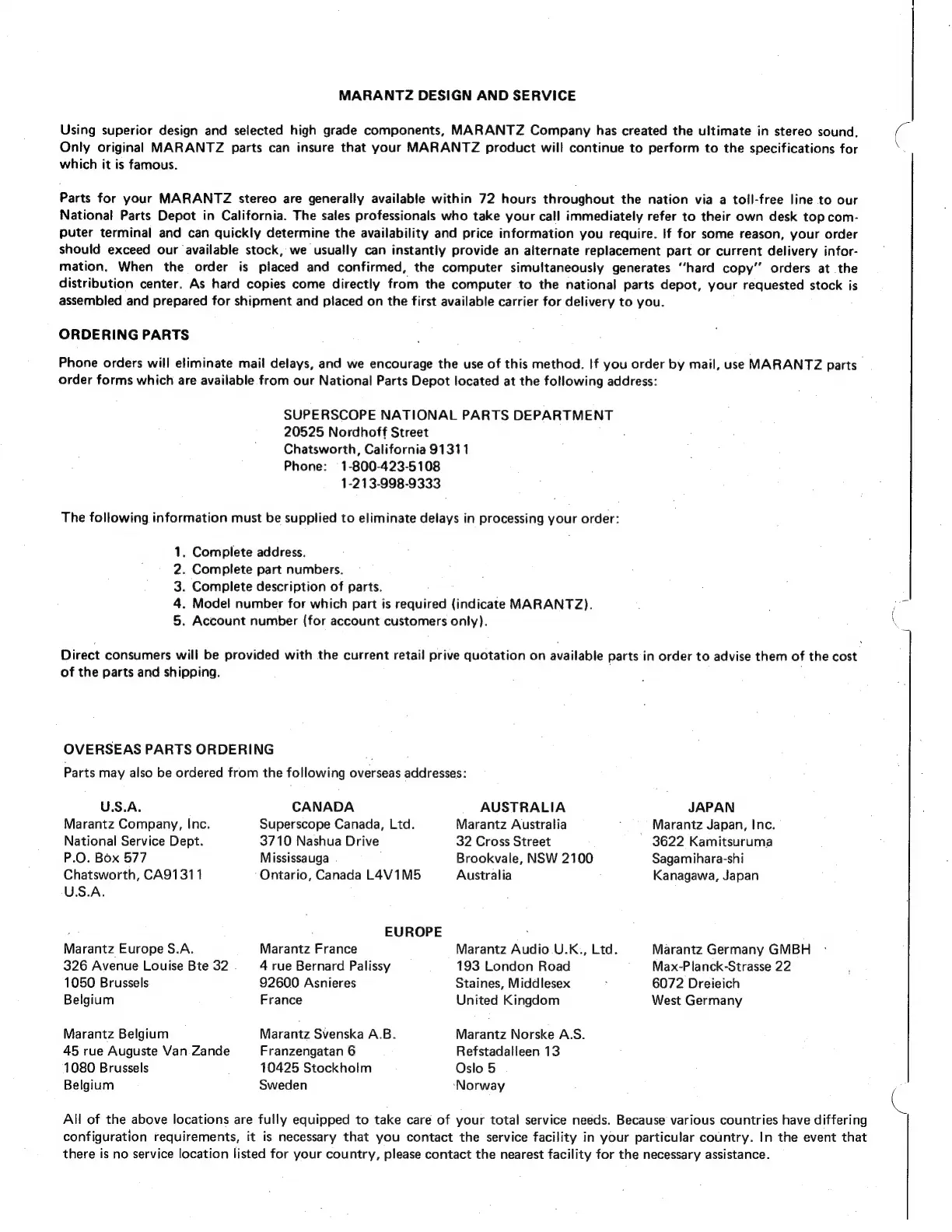 Marantz SM500DC - Marantz Service and Parts Ordering; National Parts Ordering; Overseas Parts Ordering