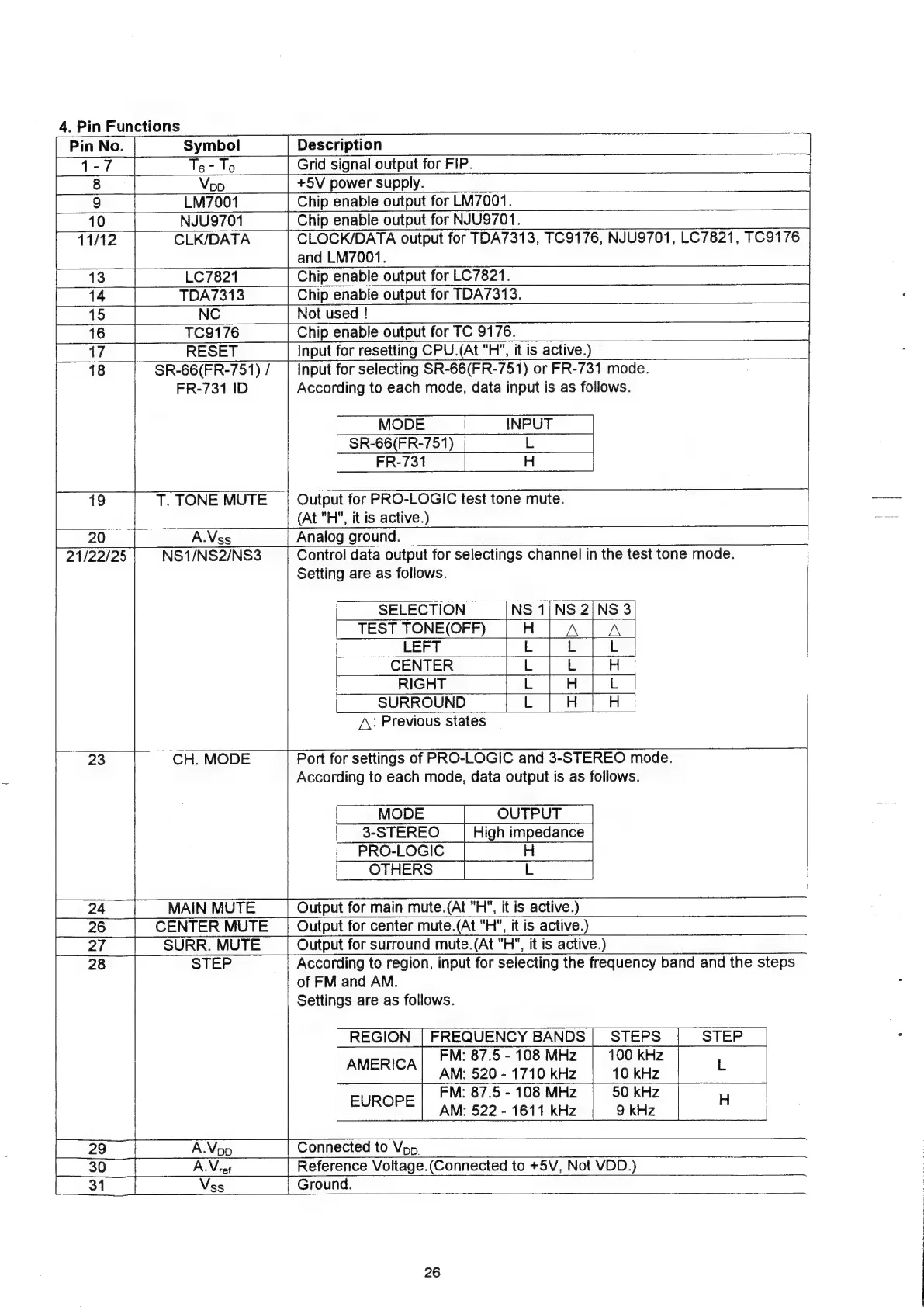Marantz SR-66 - SERVICE TEST PROGRAM OF THE MICROPROCESSOR (continued); Microprocessor Pin Functions; CH. MODE Settings; STEP Settings for FM;AM Bands