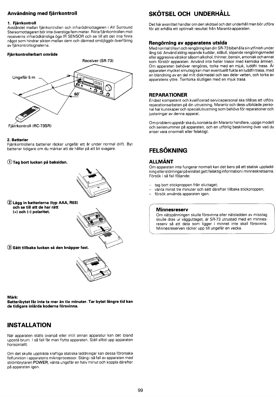 Marantz SR-73 - Anvandning Medfjarrkontrolll; Installation; Skotsel Och Underhall; Rengérning Av Apparatens Utsida