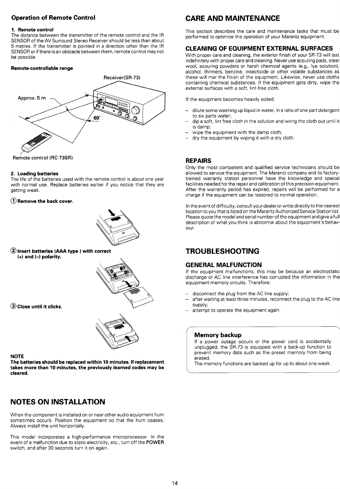 Marantz SR-73 - Marantz SR-73 Maintenance and Troubleshooting; Remote Control Operation and Maintenance; Resolving General Malfunctions; Installation Notes and Memory Backup